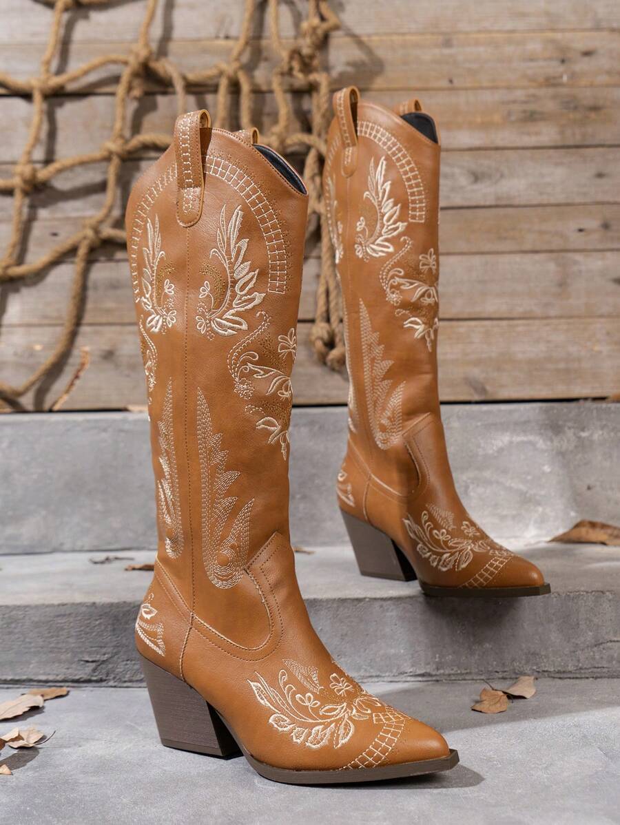 Fairycore Neue Damen Stiefel 2024 mit spitzer Zehenpartie, gesticktem Muster, dicker Absatz und Western Stil für den Außenbereich, Reitstiefel und Kniehohe Stiefel in Mode