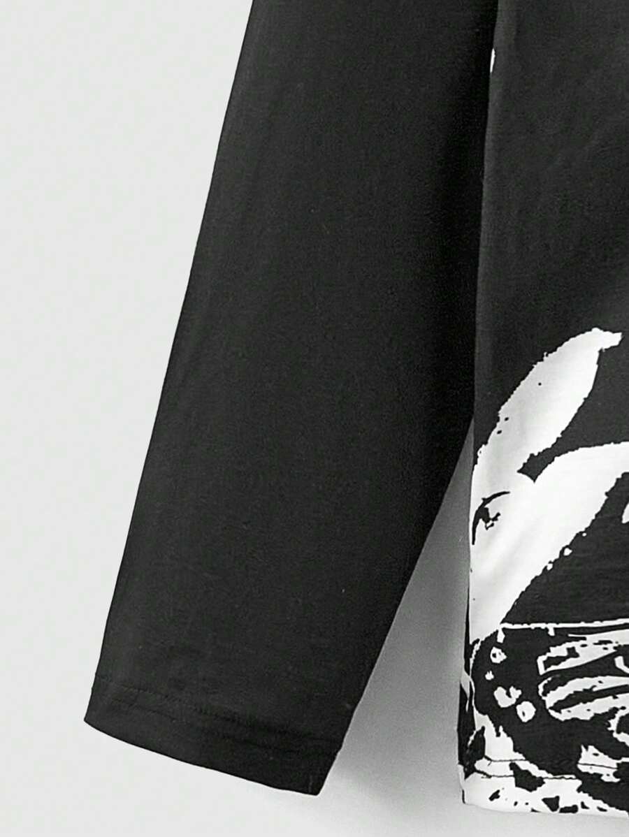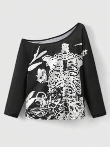Fairycore Damen asymmetrischer Kragen T-Shirt mit Totenkopf- und Schmetterlings-Muster, Langarm