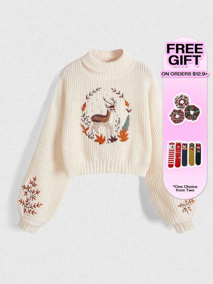 Fairycore Damen Cottagecore Hirsch Bestickter Rundhals Langarmpullover, Herbst/Winter, Drop-Shoulder