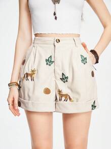 Fairycore Kurze Shorts für Frauen mit Stickerei-Design im Cottagecore-Stil mit Fuchs-, Kastanien- und Blattmotiv