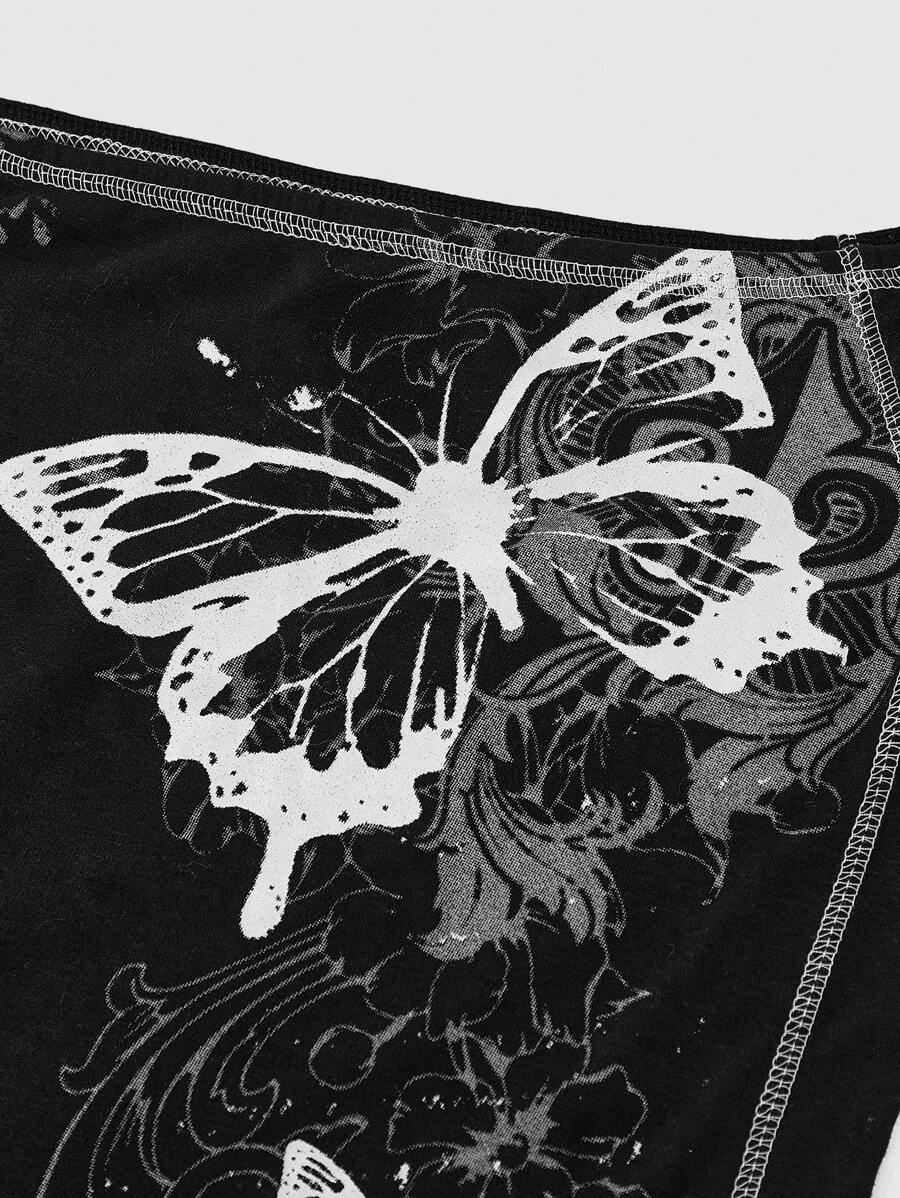 Fairycore Damen Off-shoulder Blumen Schmetterlings Gedrucktes Tee Mit Glockenärmeln Und Sichtbaren Nähten