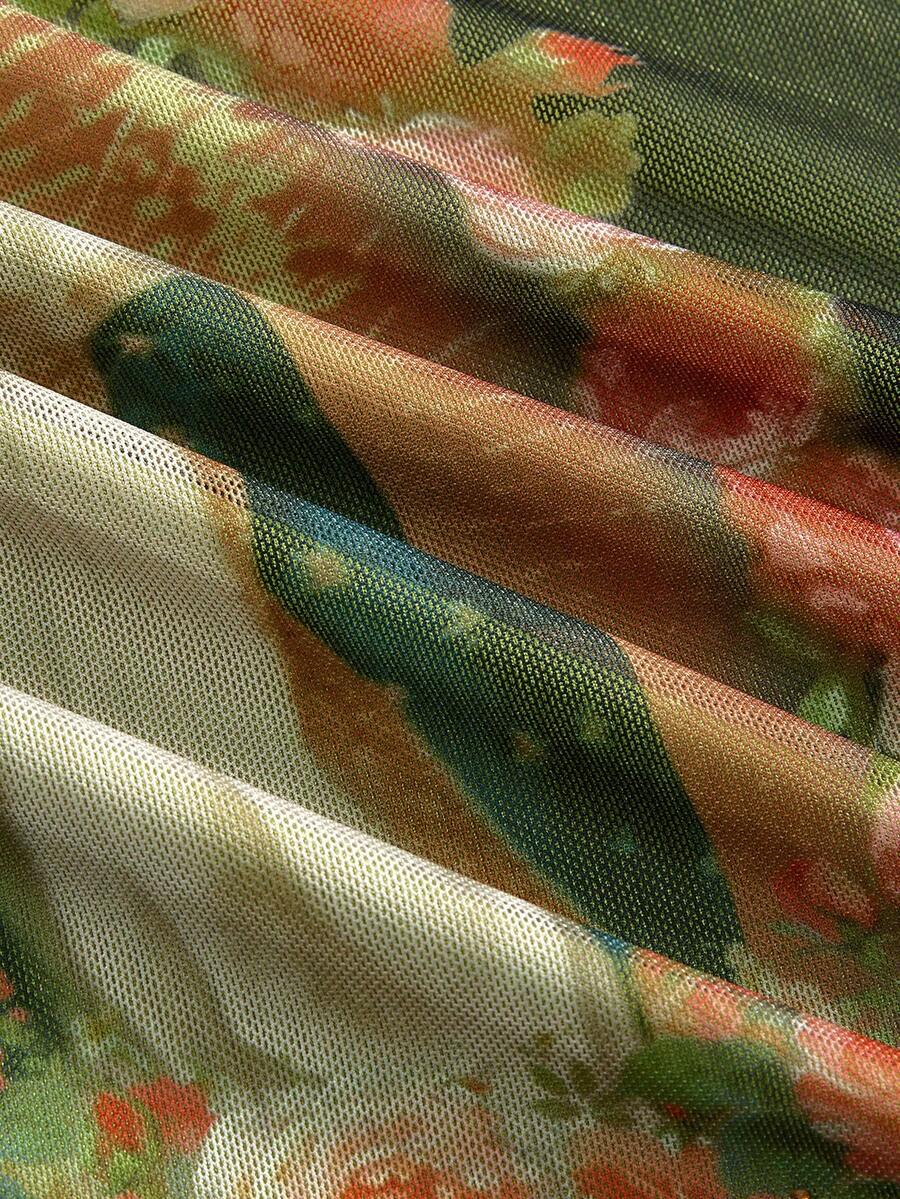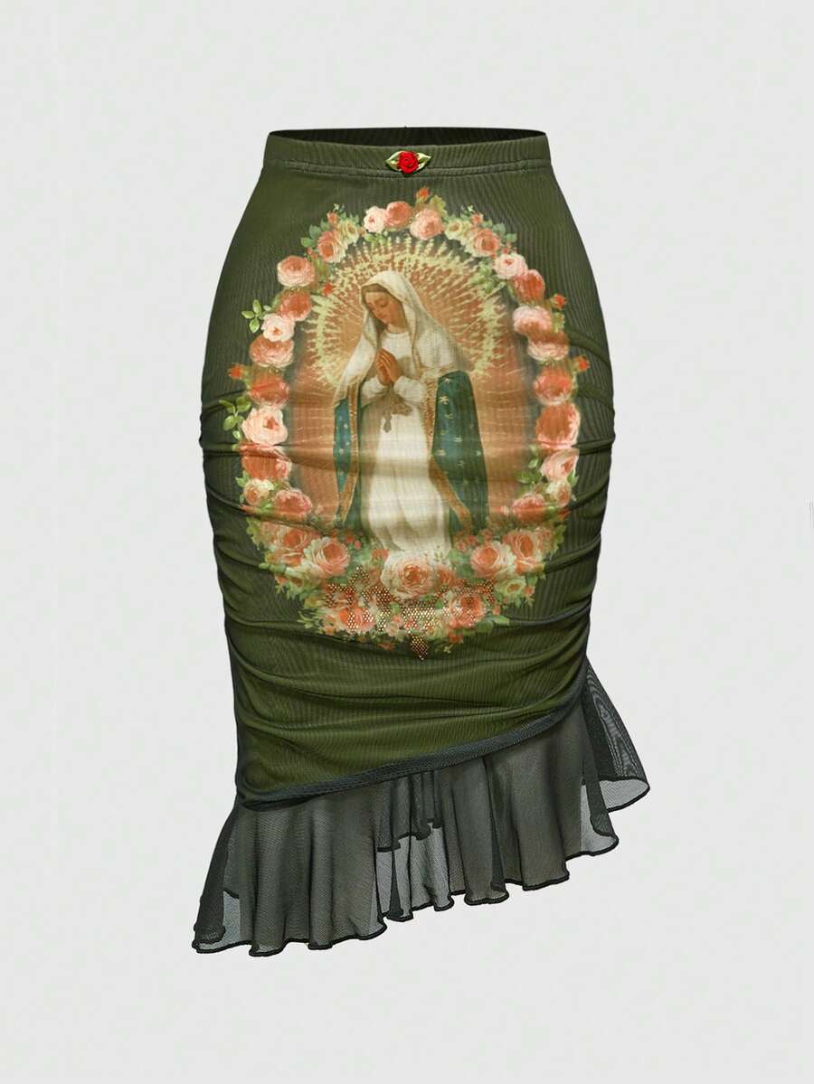 Fairycore Damen Retro Palast Stil Jungfrau Maria Grafik Grüner Mesh Rock