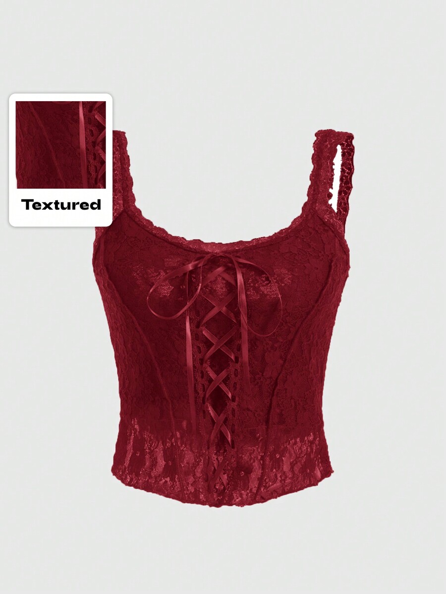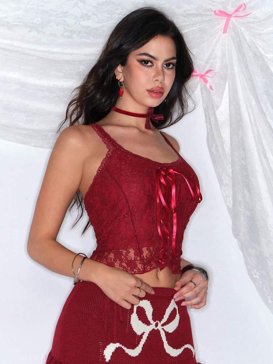 Fairycore Damen Vintage sexy Band Material Basic Schnürung Burgund Trägertop, Valentinstag