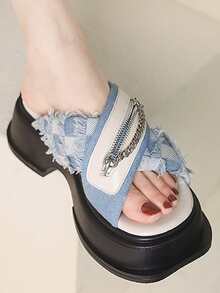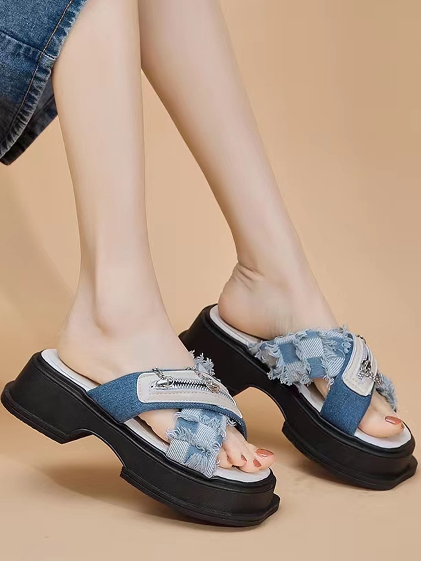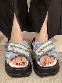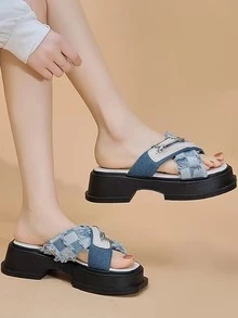 Modische Sandalen mit Keilabsatz für Damen, Criss Cross Sandalen mit Denim Reißverschlussdekor