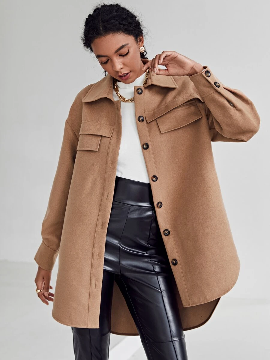 Wollmischung Mantel mit Klappen Detail, Knöpfen und gebogenem Saum