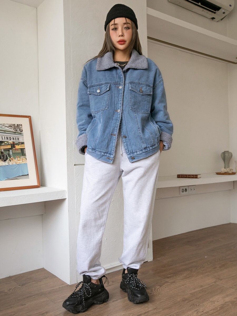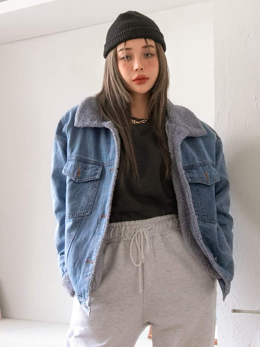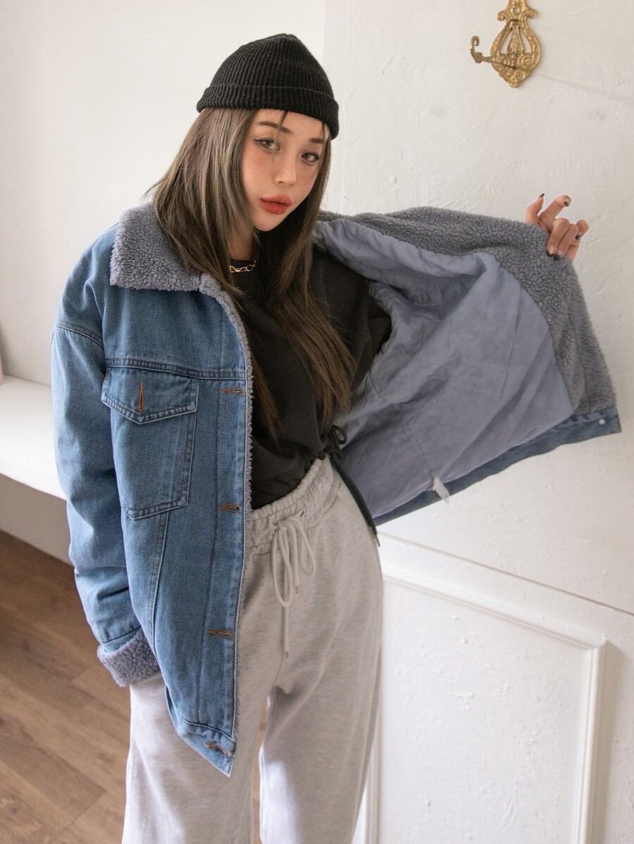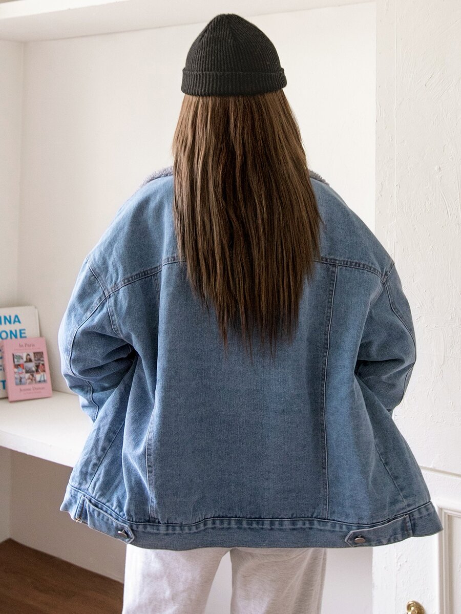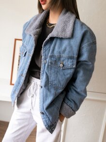 Jeansjacke mit Pattentasche, Teddy Futter