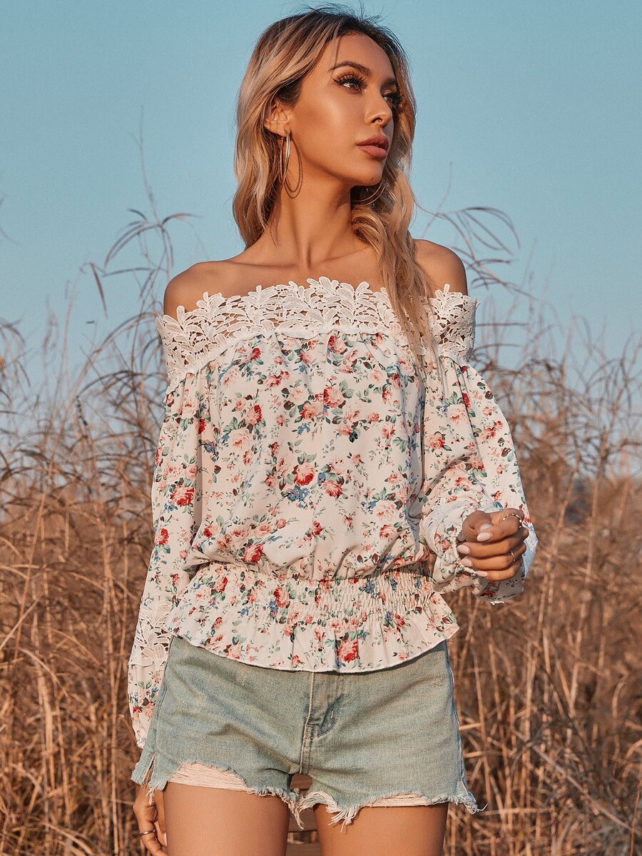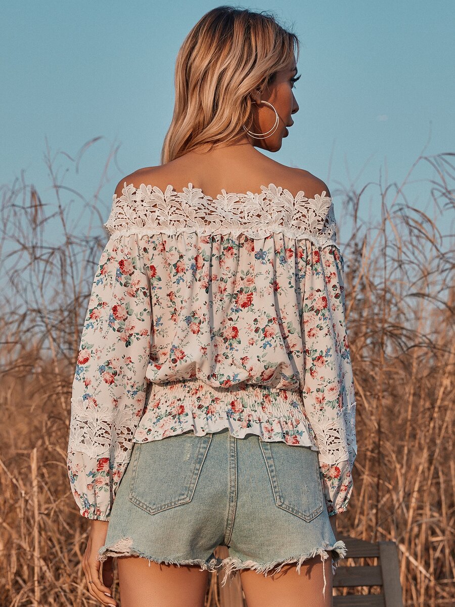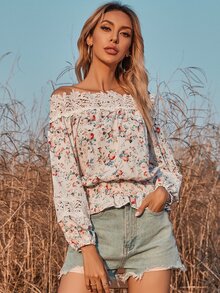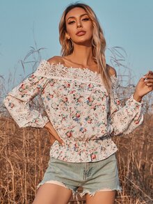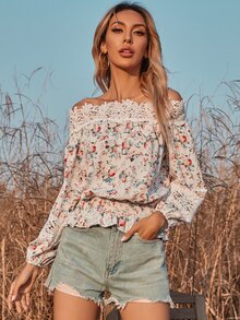 Schulterfreie Bluse mit Blumen Muster und Kontrast Spitzen