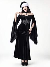 Goth Gotischer, eleganter, sexy Damenkleider mit offener Schulter, weiten Ärmeln, Meerjungfrauensaum, aus Spitze und Samt Patchwork