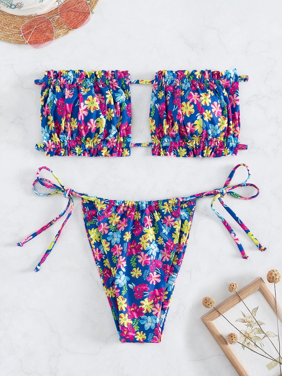 Bikini-Set für den Sommer am Strand mit Blumenmuster, Rüschen und Bandeau-Oberteil