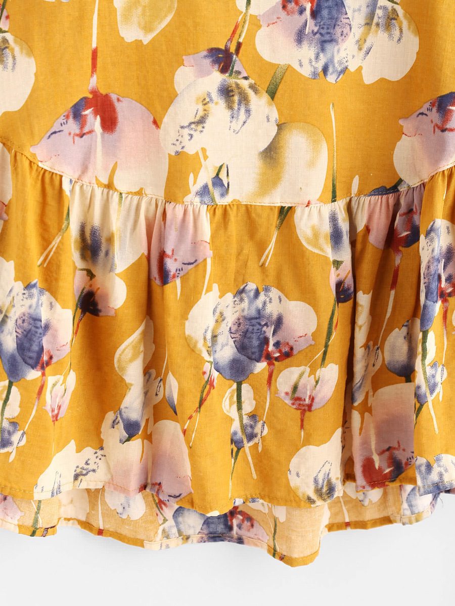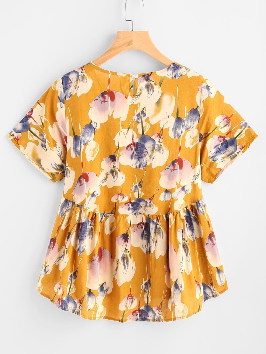 Gesmockte Bluse mit Blumenmuster, Schlussloch hinten und abfallendem Saum
