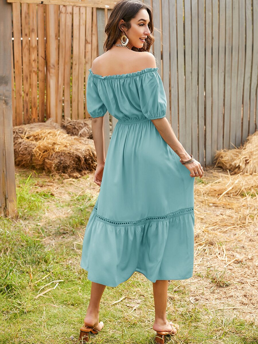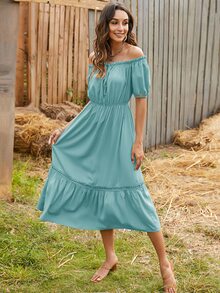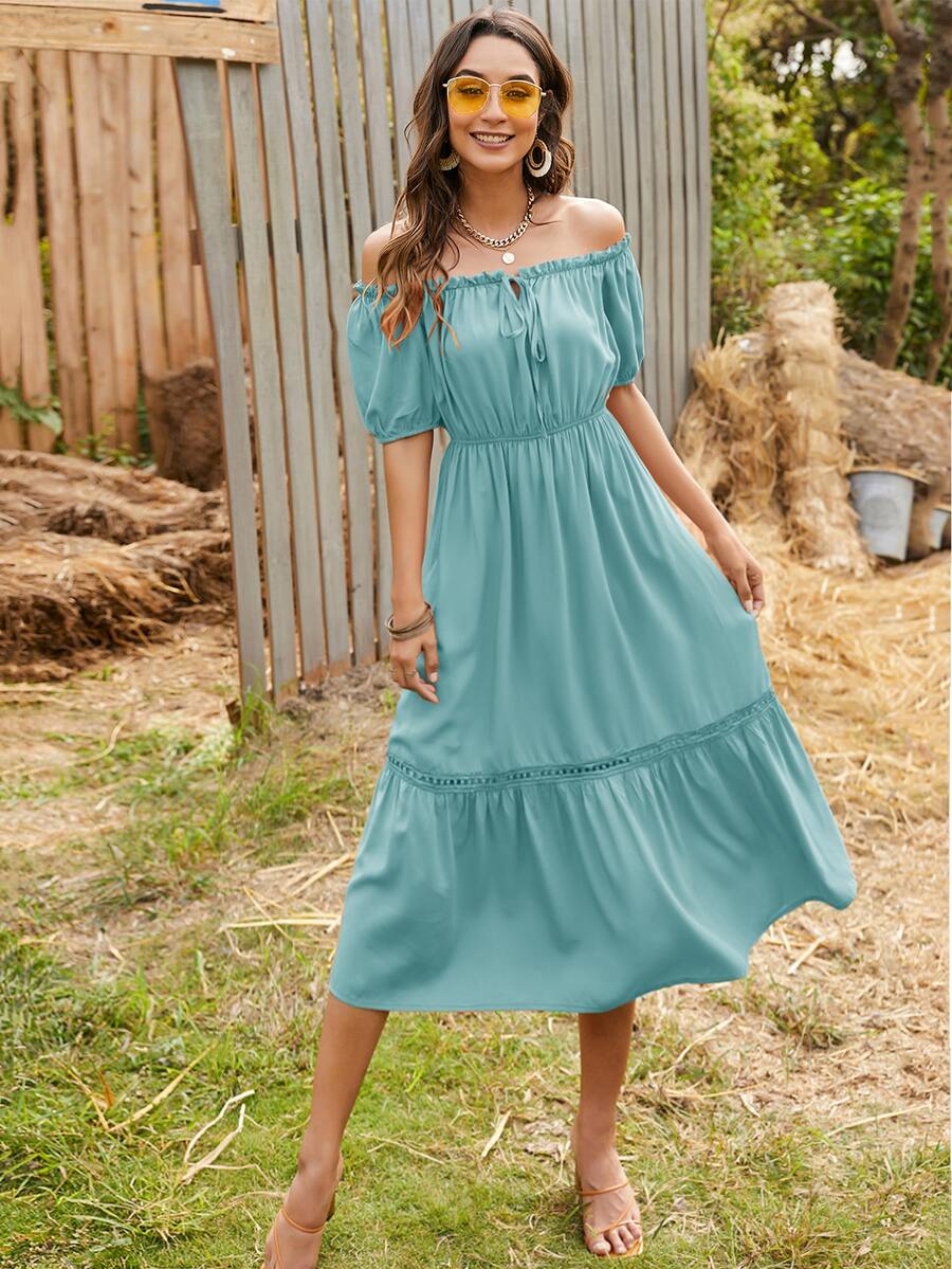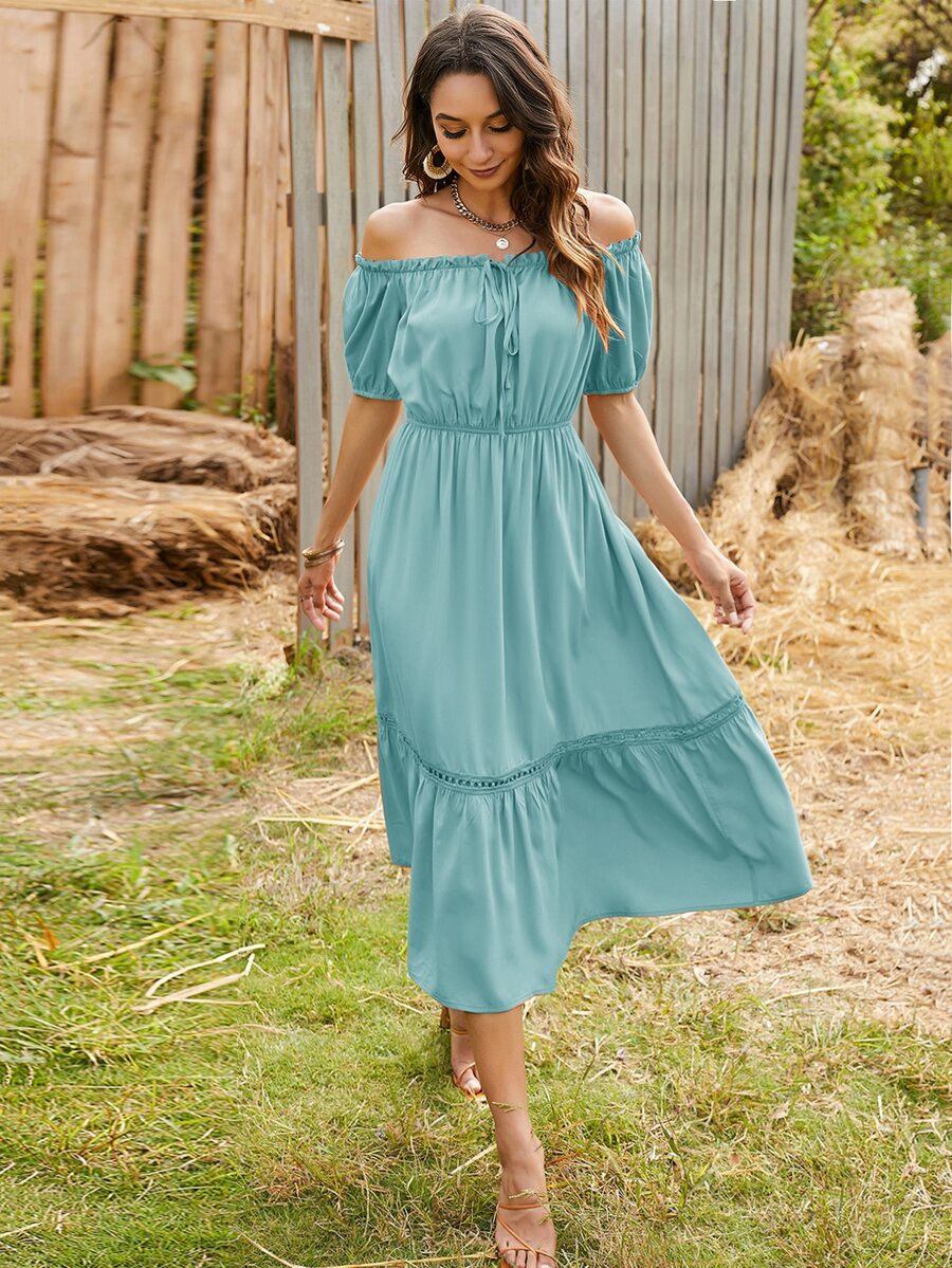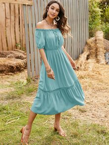 Schulterfreies Kleid mit Rüschen, Band vorne und Puffärmeln