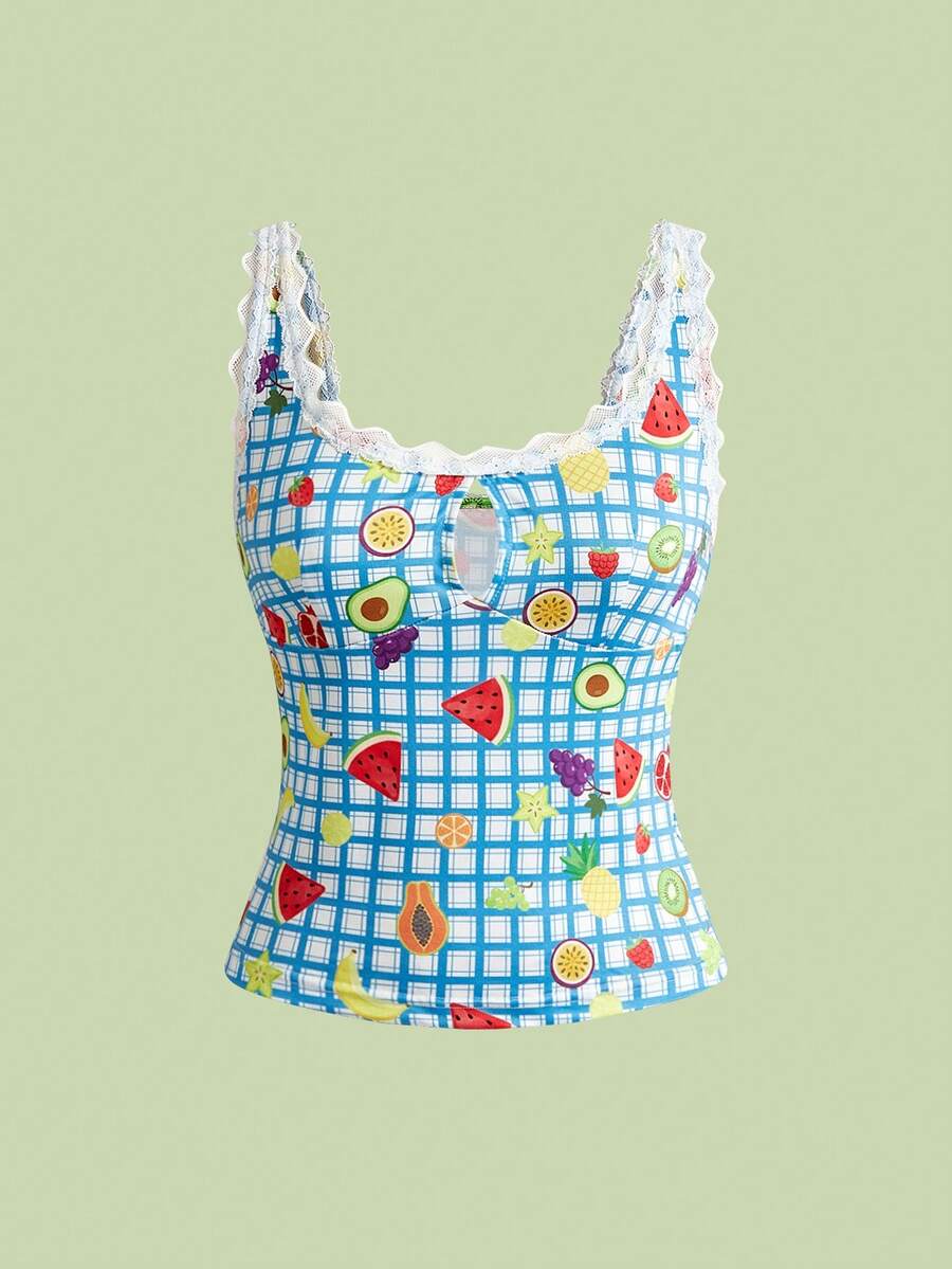 Fruchtmädchen kariertes tropisches Frucht Wassermelone Ananas Muster Spitze Patchwork Cut Out figurbetontes Damen Trägertop