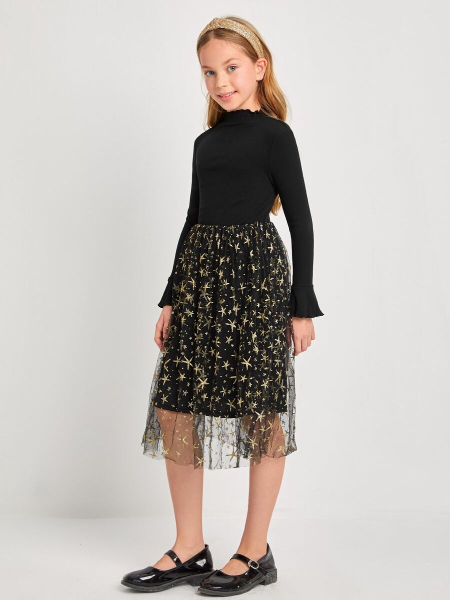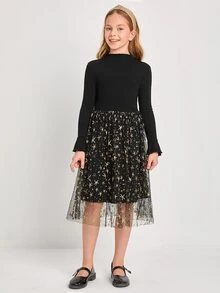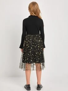 Kleid mit Schößchenärmeln, Galaxie Muster und Mesh-Saum