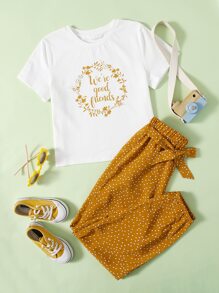 T-Shirt mit Buchstaben Grafik & Hose mit Punkten Muster und Band vorne Set