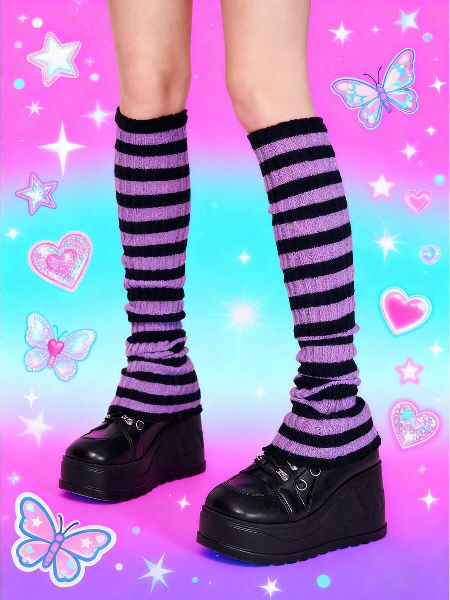 Goth 1 Paar überkniehohe gestrickte Socken, warme gestreifte Kontrastfarben Stulpen-Socken für Herbst und Winter, vielseitig einsetzbare farbige Beinabdeckungen für den Alltag