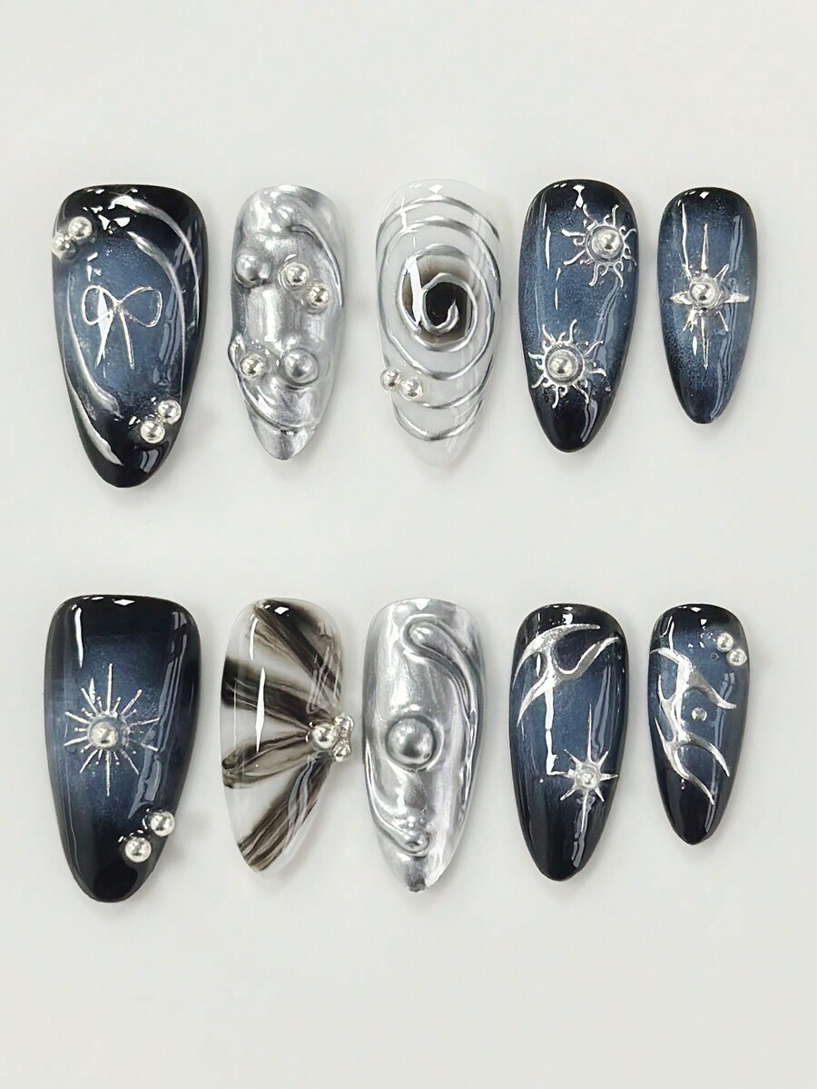 Goth 10 Stücke hochwertige dunkle Fünf-Sterne handgefertigte Kunstnägel + 3 Stücke doppelseitiges Klebeband, metallischer Punk Y2k Nagelkunst, abnehmbare handbemalte Nagelaufkleber, geeignet für Festivals, Partys, Tanzen und den täglichen Gebrauch