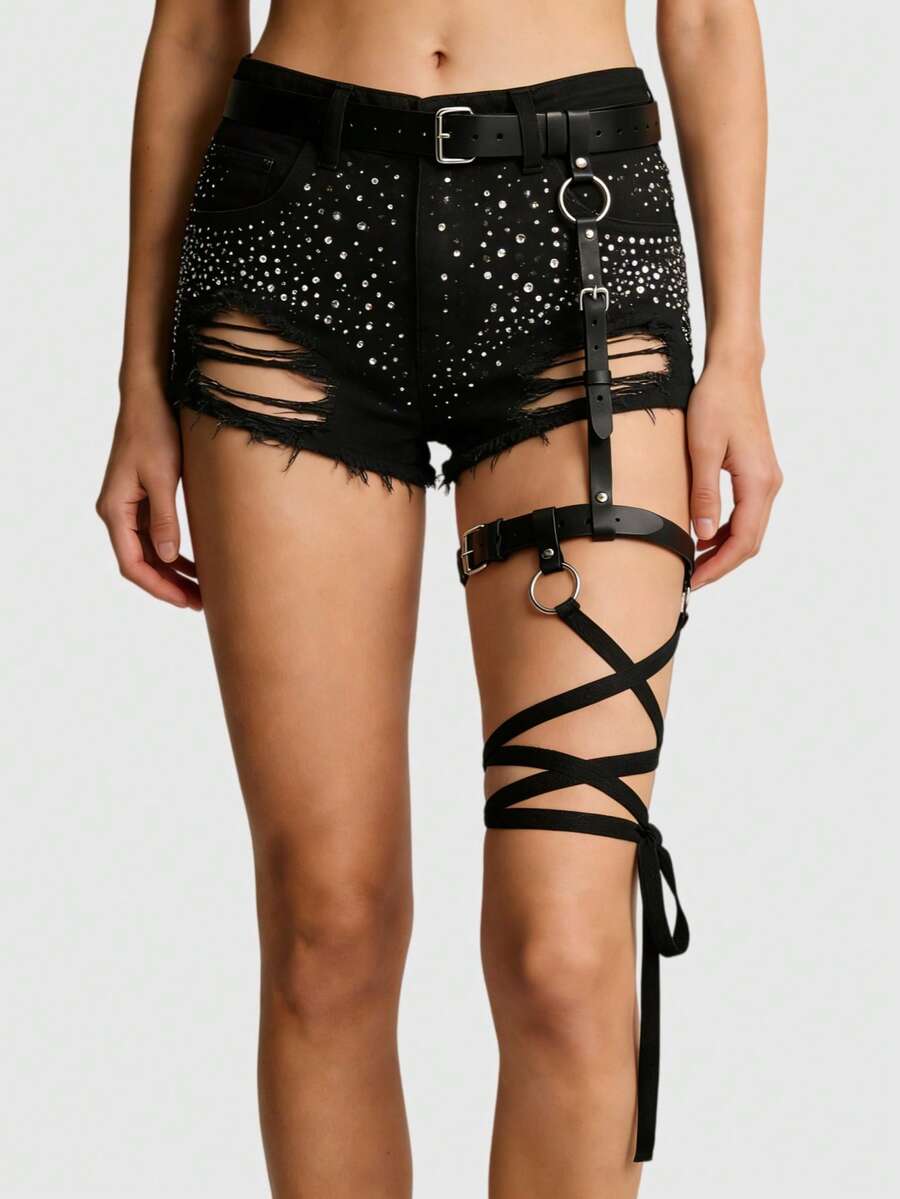 Goth 1 Stück Schwarzer Y2K Punk Stil Metall Nieten Dekor Sexy Schnürung Strumpfhalter Set, geeignet für Straße, Date, Musikfestival, Nachtclub, usw.