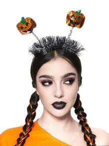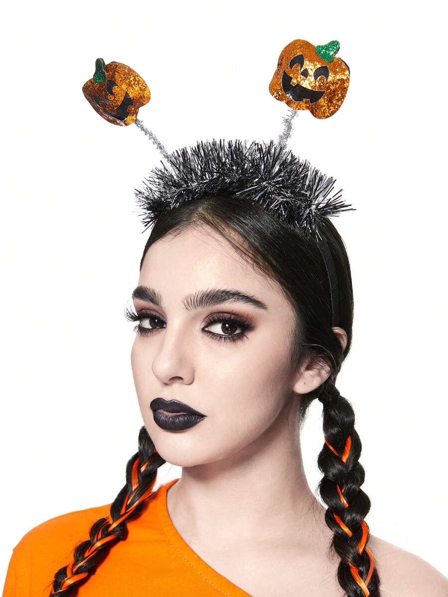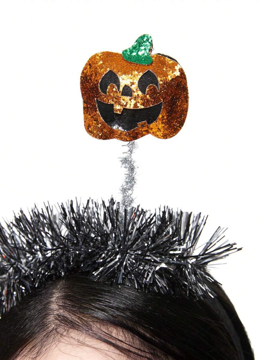 Goth 1 Stück Halloween Haarreif mit 3D Kürbis Plüsch Dekor, dunkelsilberner Glitzer Feder, geeignet für Party, Cosplay, Bühnenauftritte