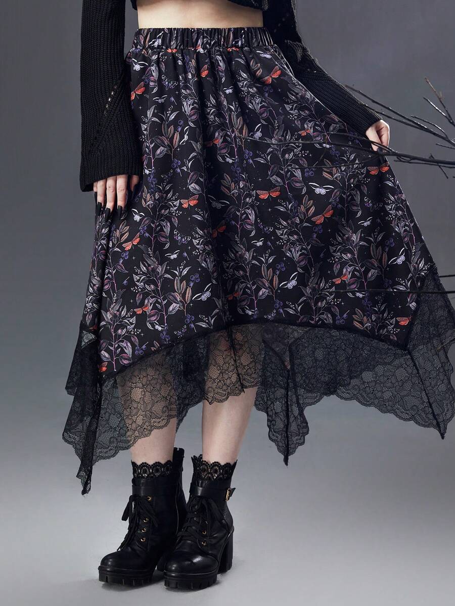Goth Rock mit Pflanze Muster, Kontrast Spitzen, asymmetrischem Saum