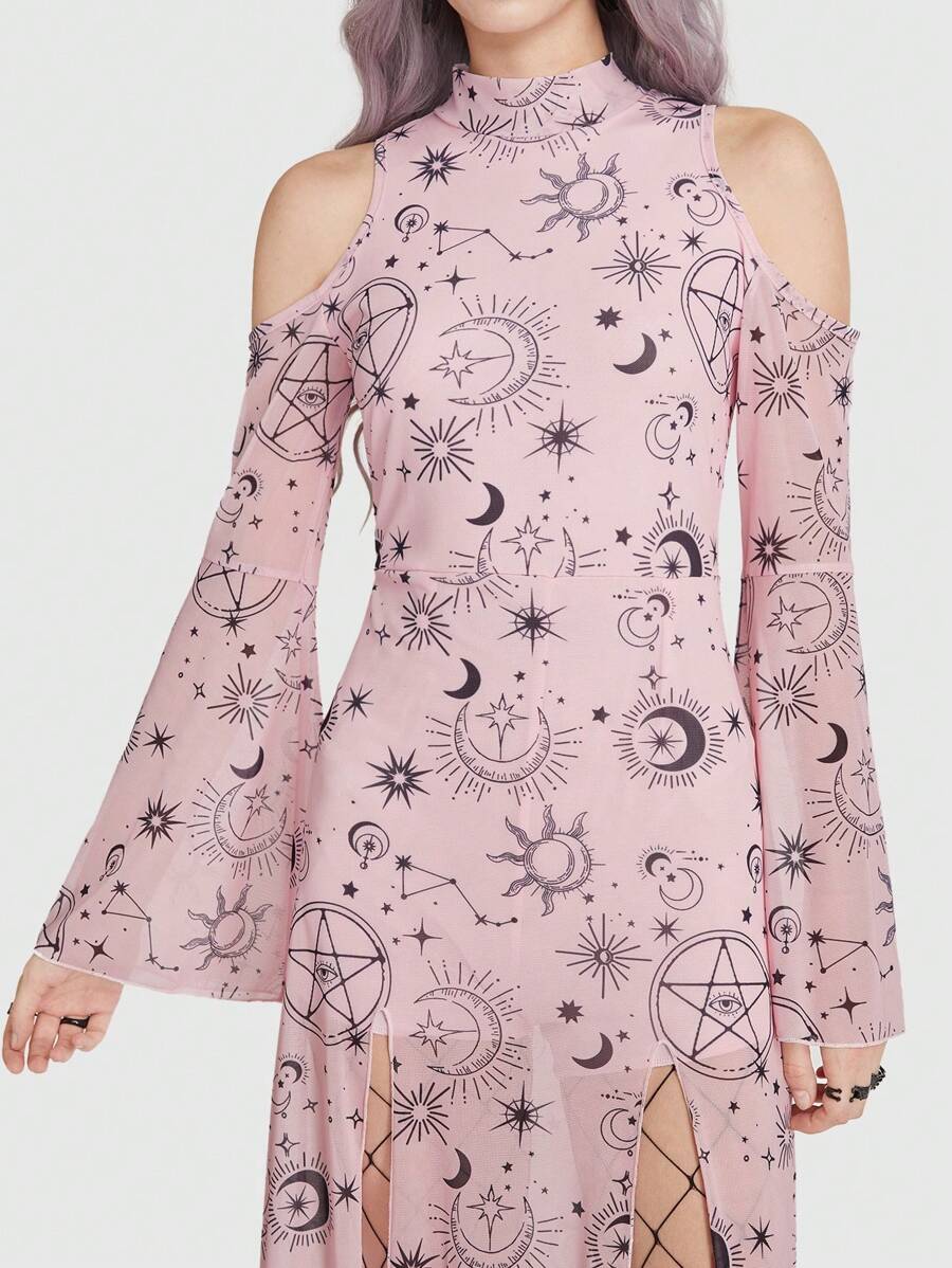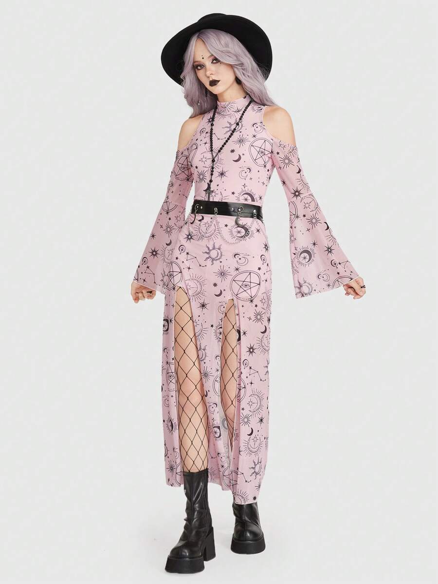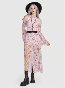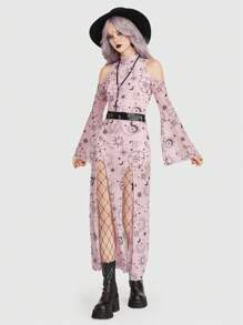 Goth Allover-Print, schulterfreies, geschlitztes Kleid mit Volantärmeln am Oberschenkel ohne Gürtel