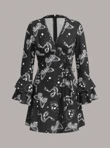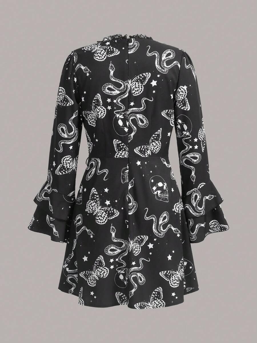 Goth Wickelkleid mit Schmetterling & Schlange Muster, Volant Ärmeln, seitlichem Knoten,
