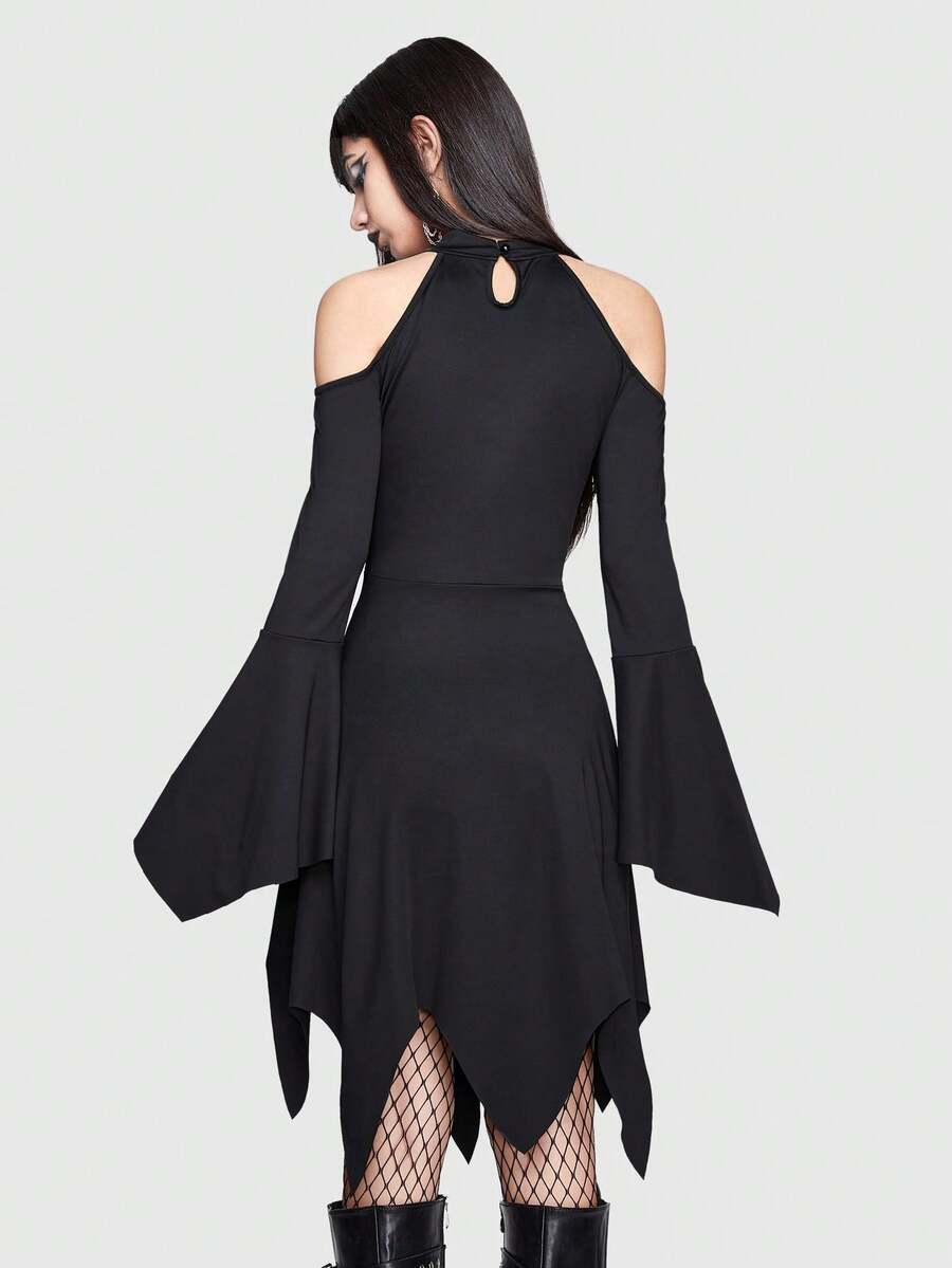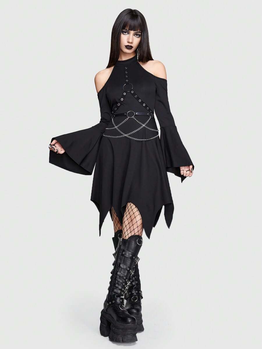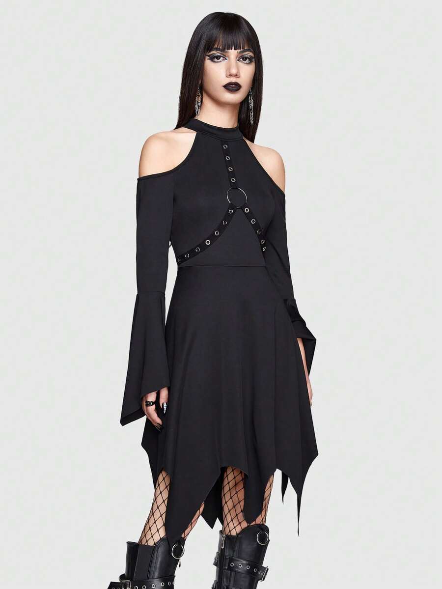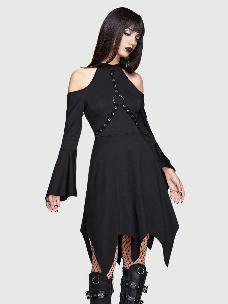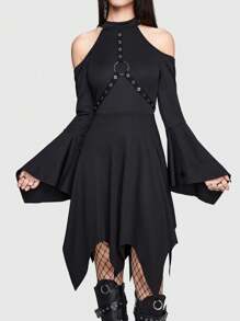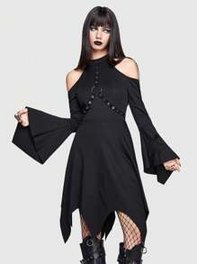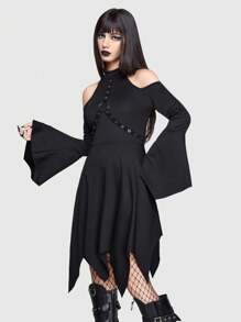 Goth Kleid mit schulterfrei augestellten Ärmeln, asymmetrischem Saum
