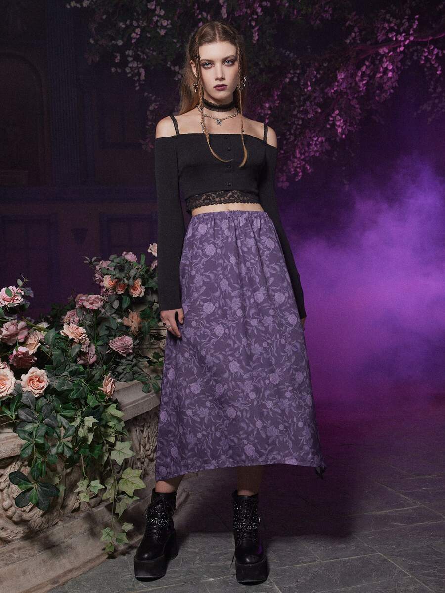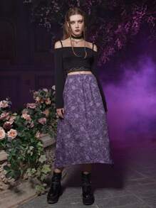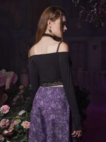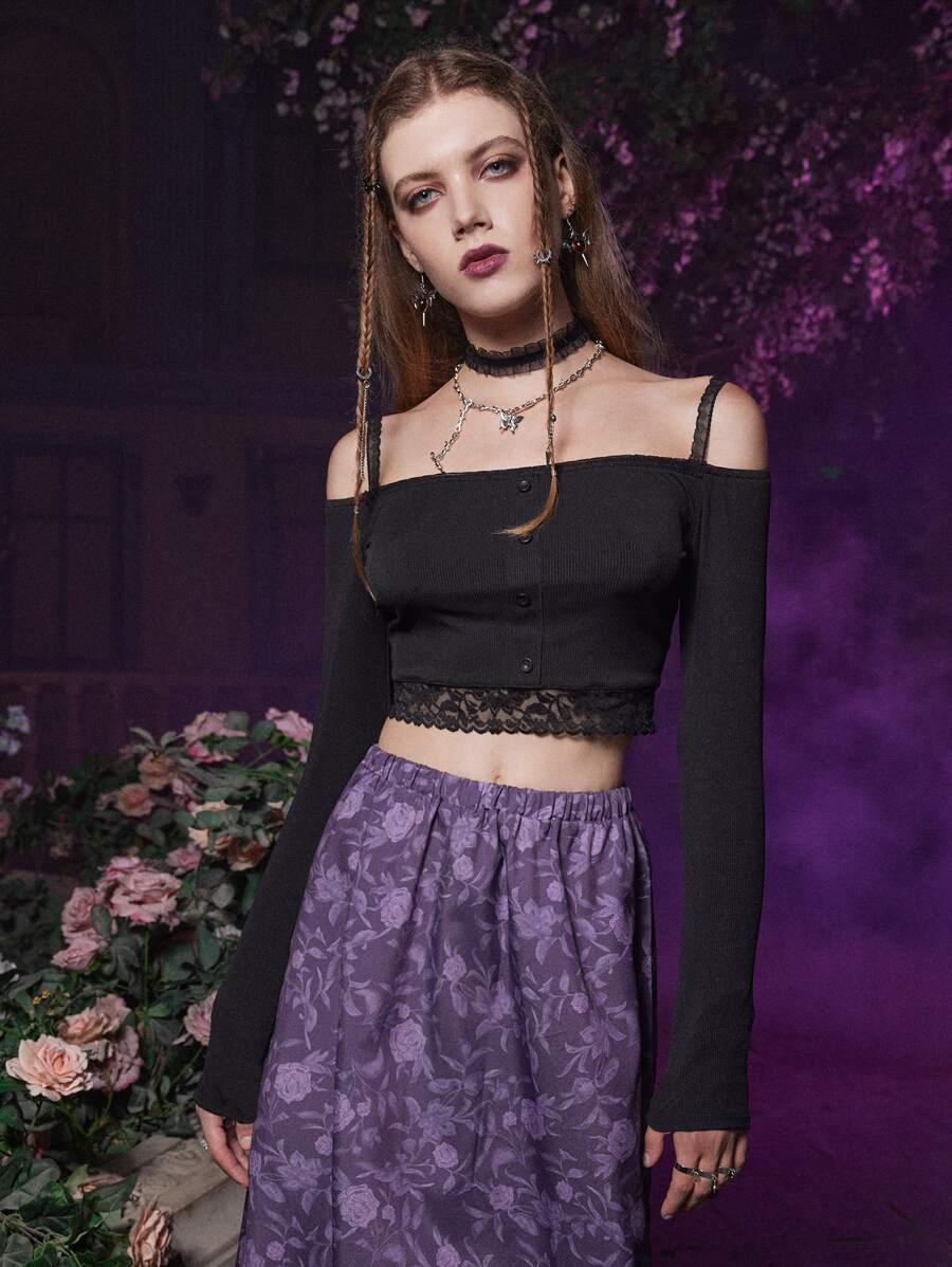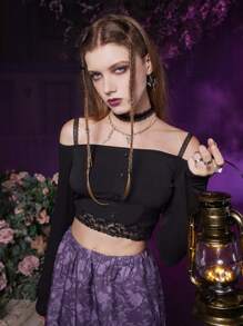Goth T-Shirt mit Kontrast Spitzen, Knopf