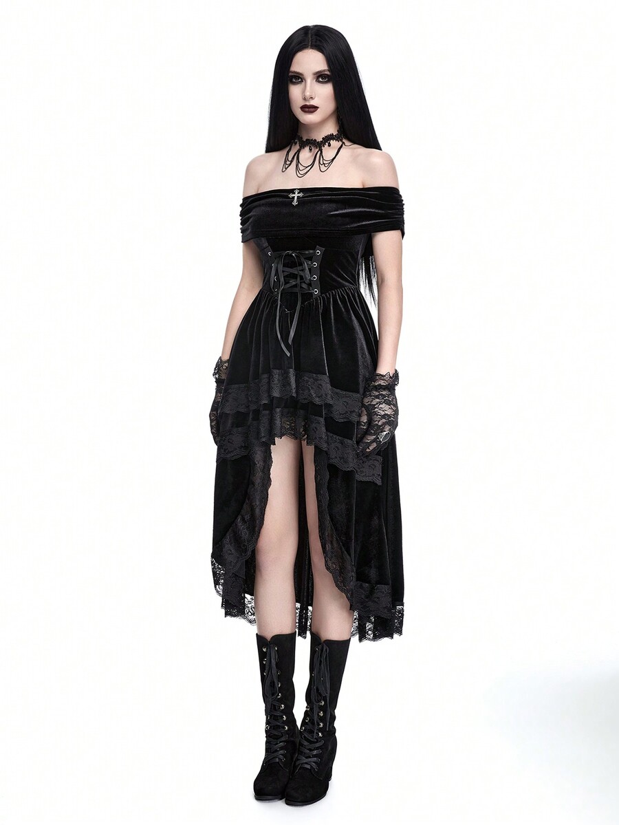 Goth Dunkelgotisches A-Linien Mittellang Kleid im Palast-Stil mit Off-Shoulder Ausschnitt und Kreuz-Metalldekoration für Damen