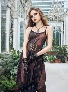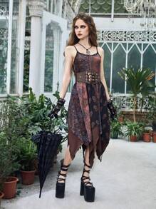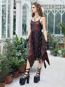 Goth Cami Kleid mit Blume Muster, Zipfelsaum, ohne Gürtel