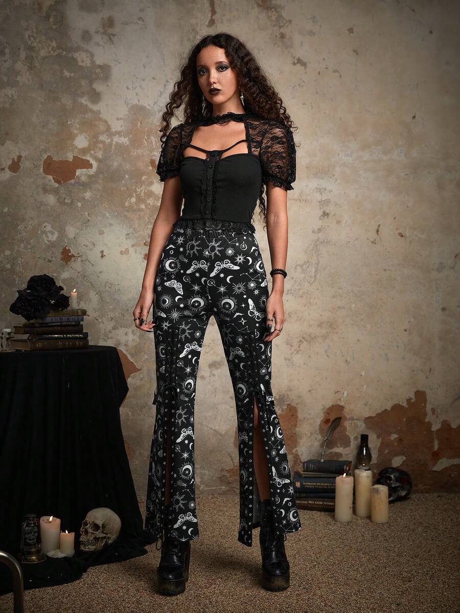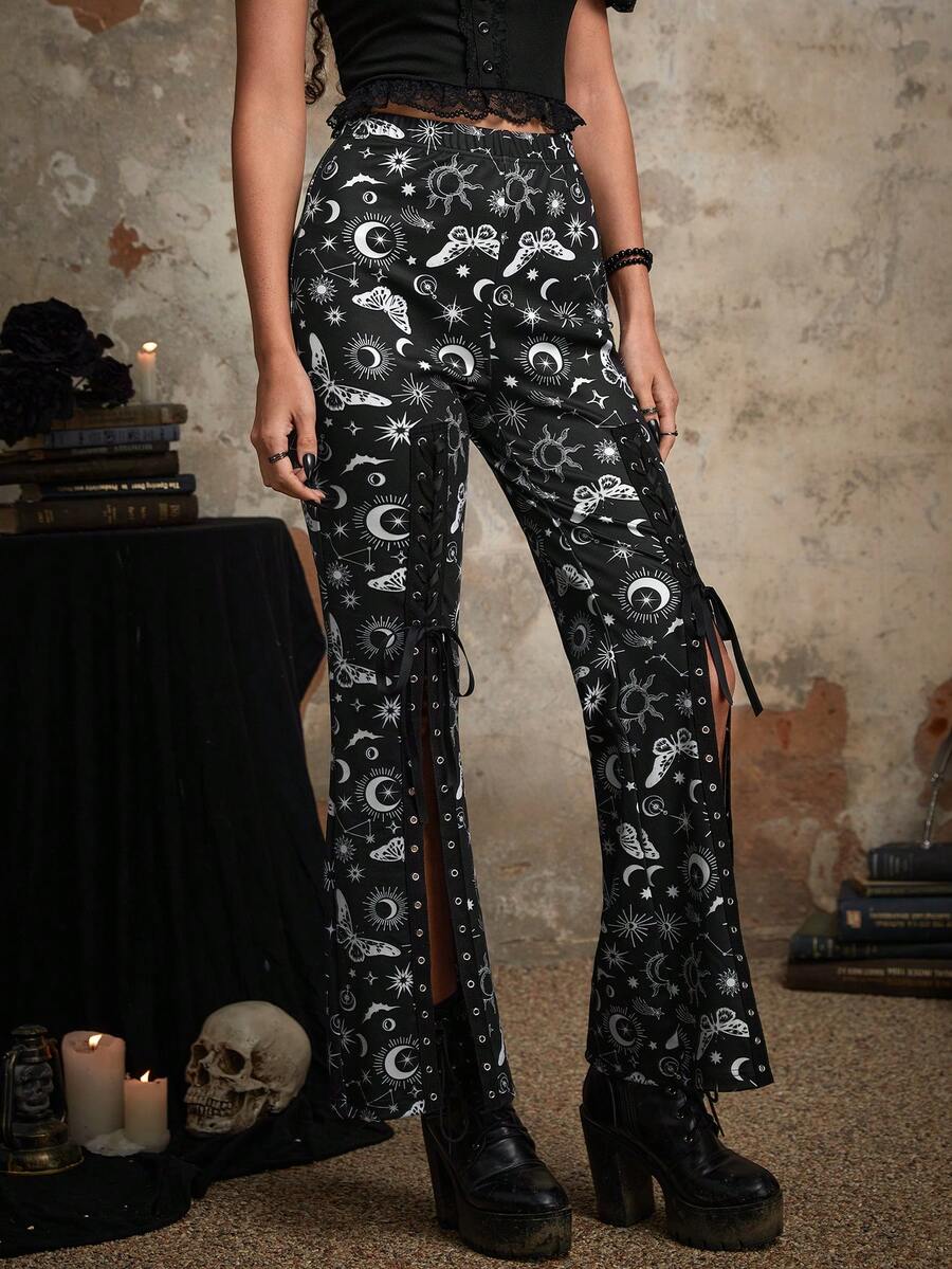 Goth Schlaghose mit Galaxis Muster, Schlitz, Band,