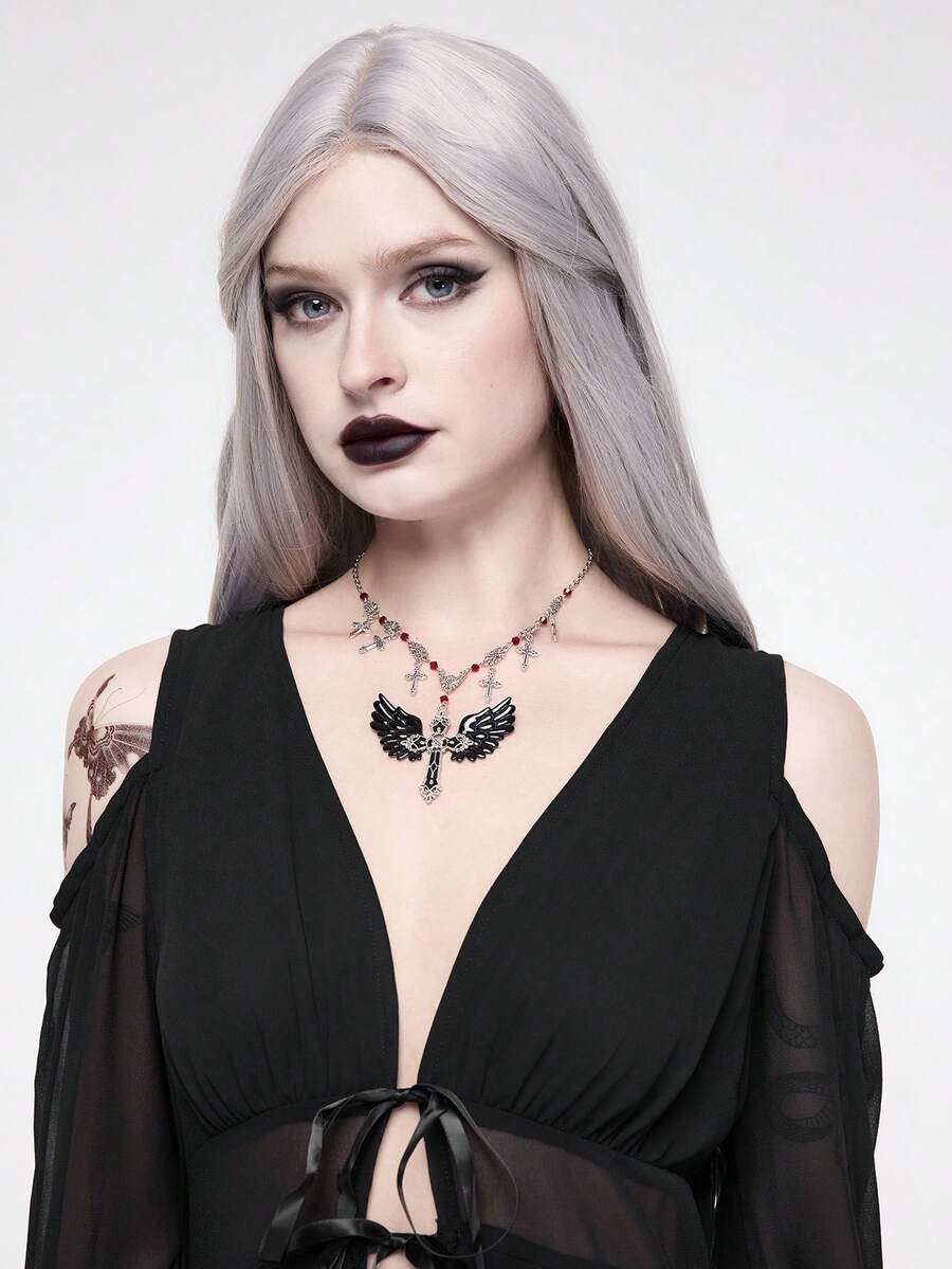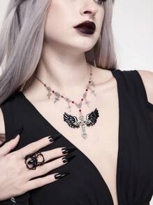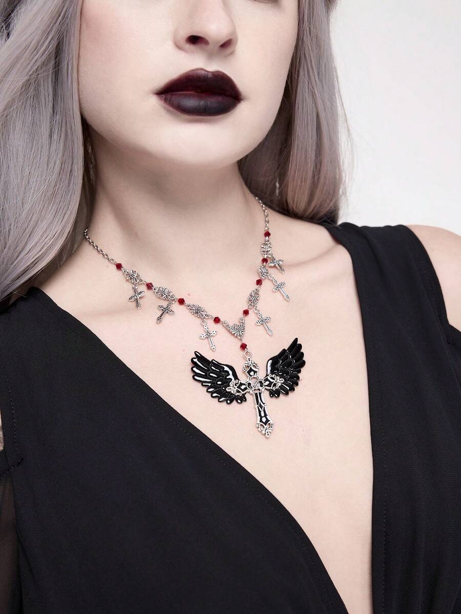 Goth Gotischer Vintage Kreuz Fransen Künstliche Kristall Perlen Flügel Anhänger Halskette für Frauen