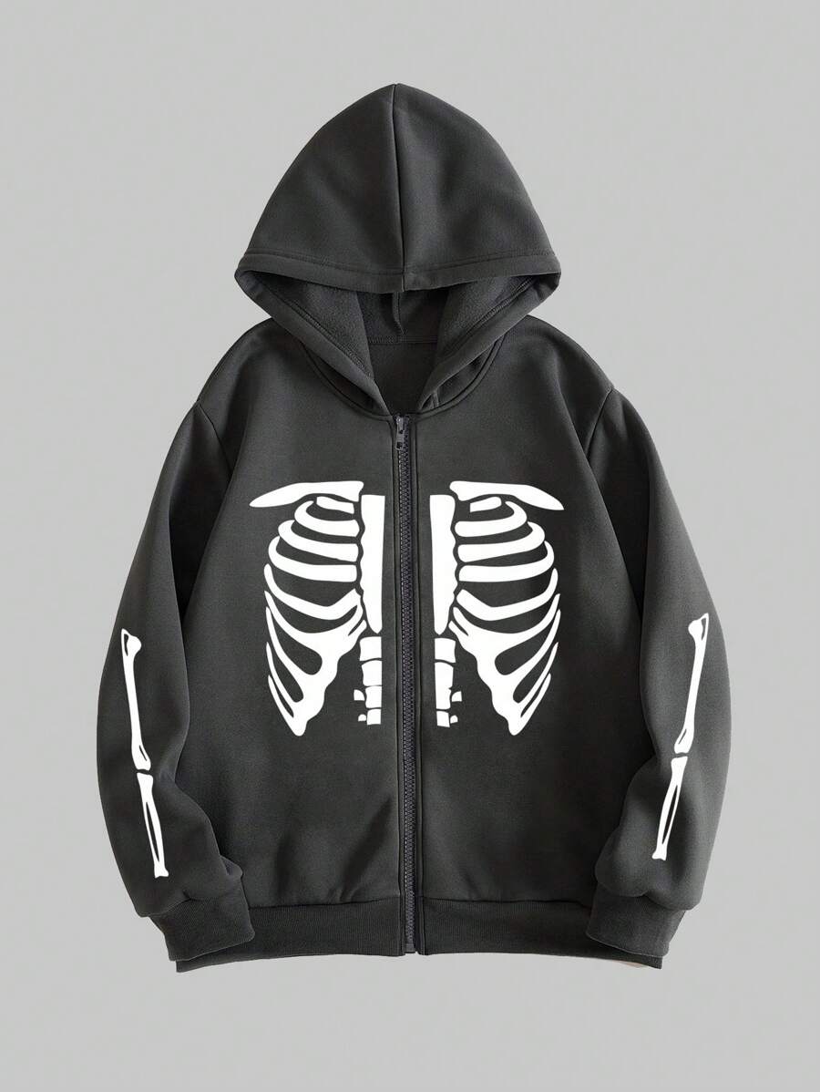 Goth Männer Hoodie mit Skelett Muster, Reißverschluss, Thermal Futter,