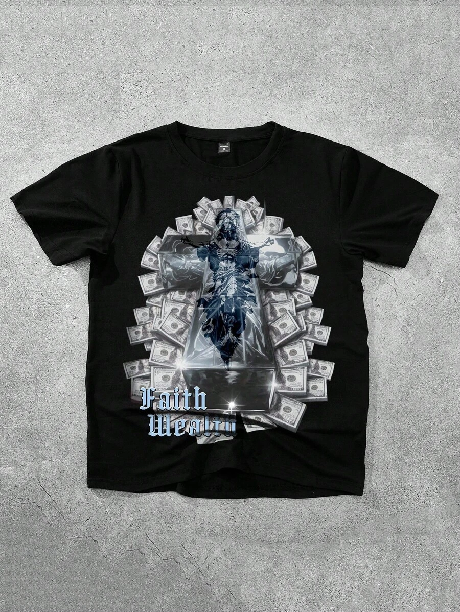 Goth Herren schwarzes T-Shirt mit Kreuz, Jesus- und Geld-Design, lässiger Mode Streetstyle