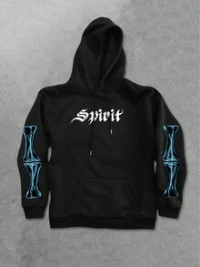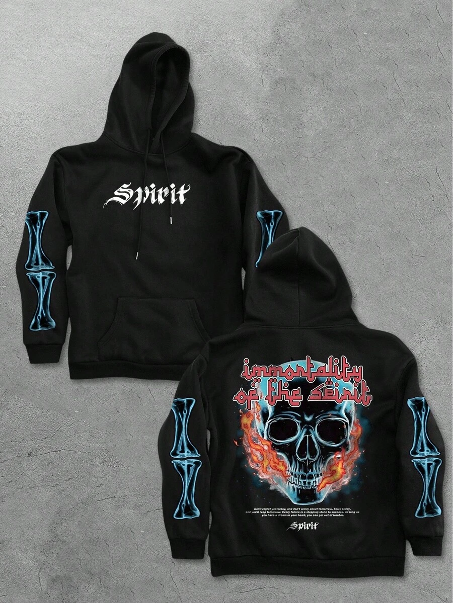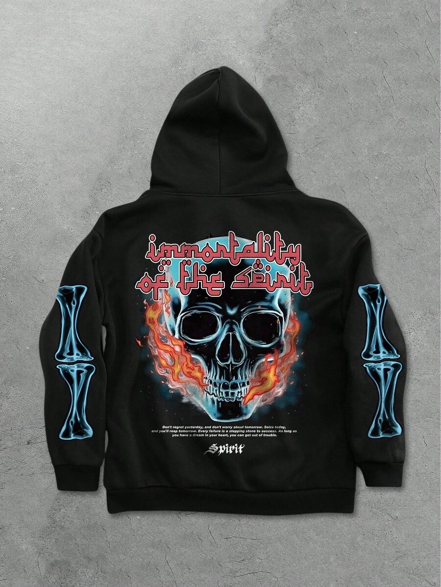 Goth Herren Schwarzer Hoodie mit bequemem Flammen-Totenkopf Grafik