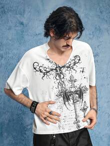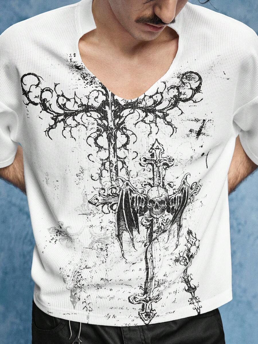 Goth Herren Kreuz Muster V-Ausschnitt Kurzarm Weißes T-Shirt