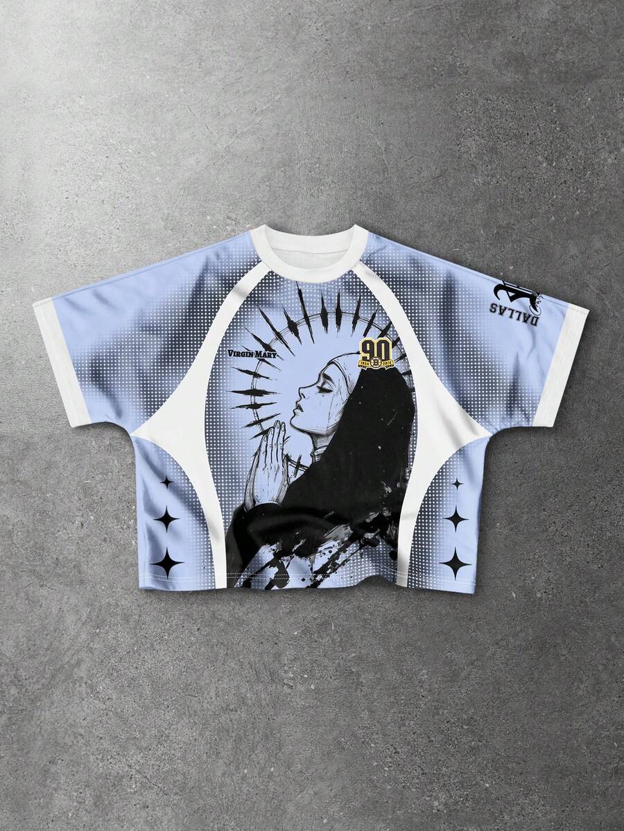 Goth Herren Lässig T-Shirt mit Buchstaben- und Heiligen-Grafik, Rundhalsausschnitt, Raglanärmel, Kurzarm
