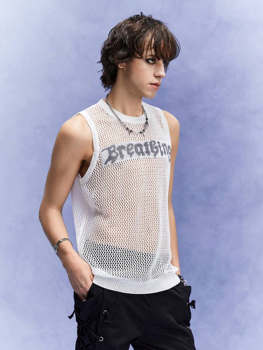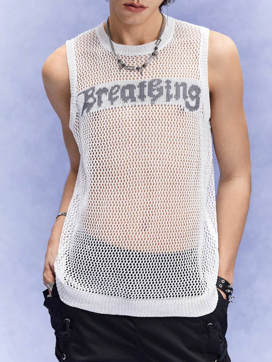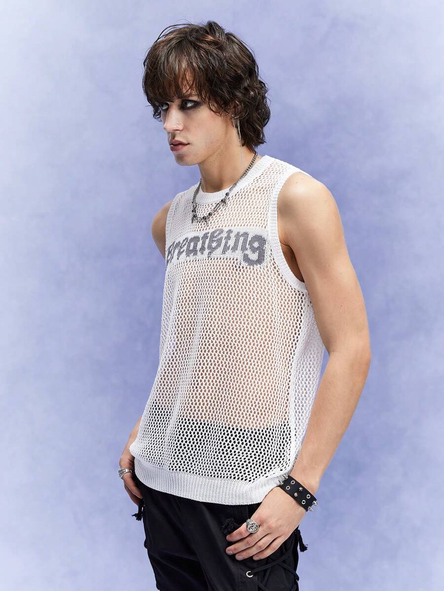 Goth Herren Sommer Lässig-Strickweste mit Lochmuster und Buchstaben Muster