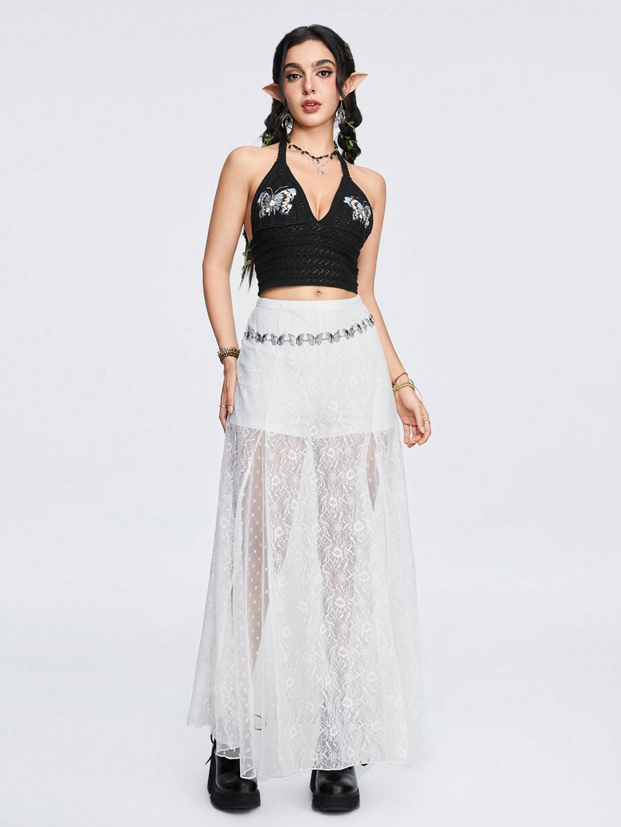Goth Minimalistisches, sexy Sommer- und Urlaubsoberteil mit Schmetterlingsstickerei und Schleife für Frauen, gestrickt