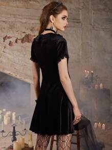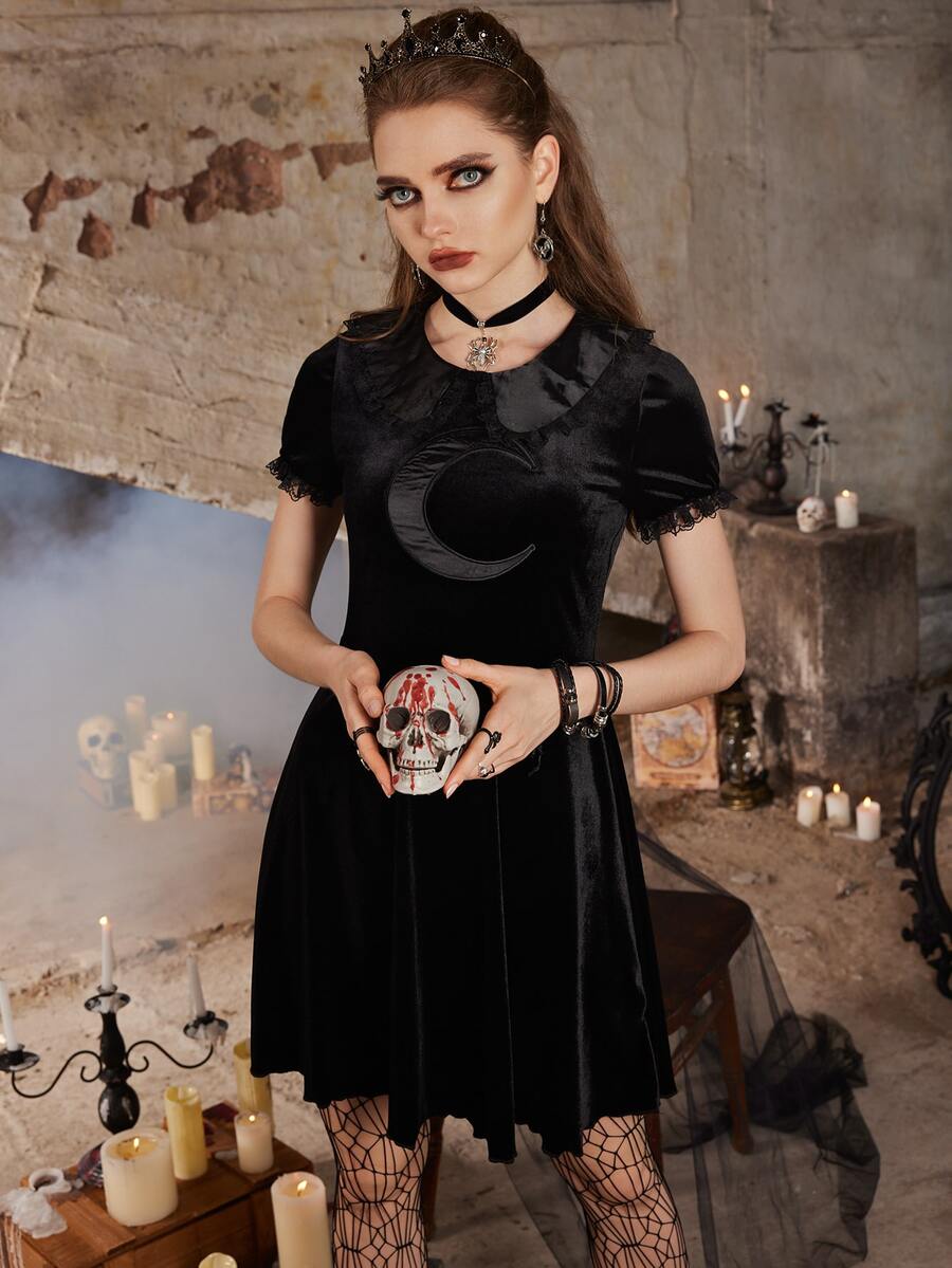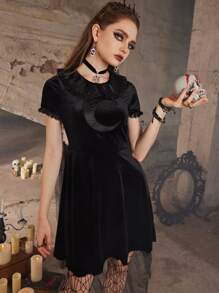 Goth Kleid mit Mond Stickerei, Samt Kontrast Spitzen