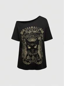 Goth Oversized Loose Fit T-Shirt mit schwarzer Katze Grafik und Drop Shoulders, Kurzarm