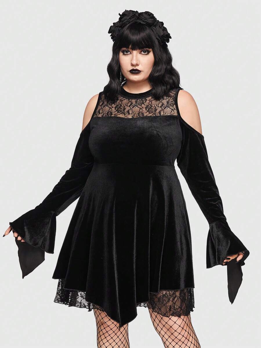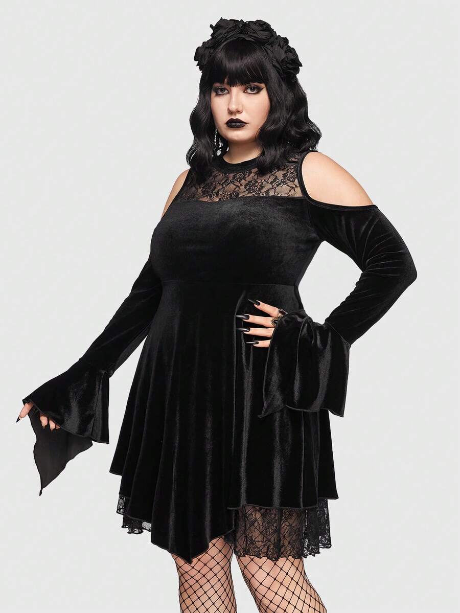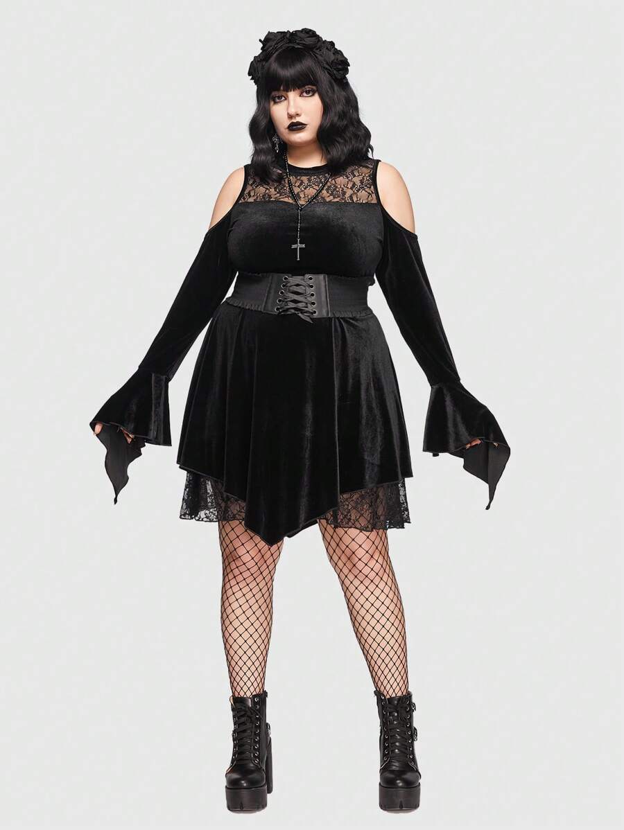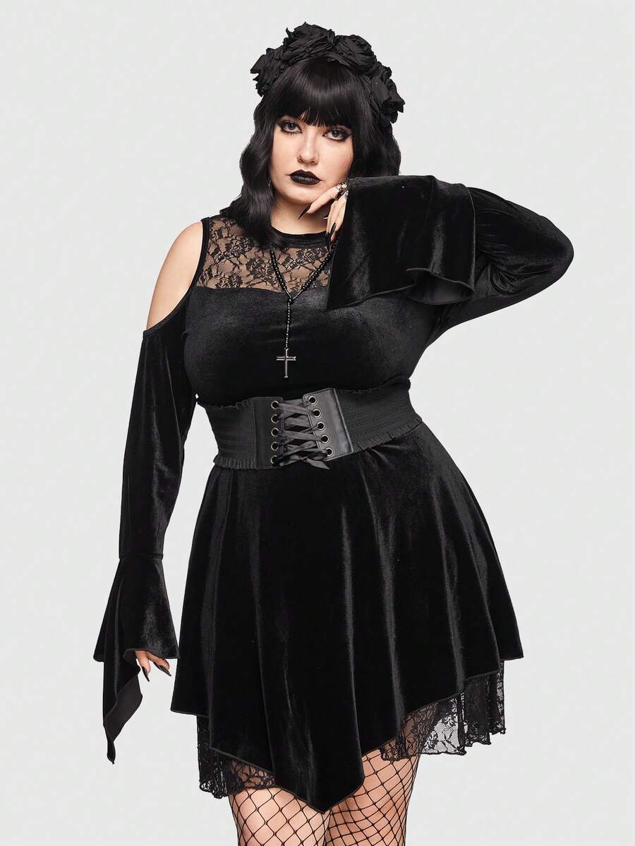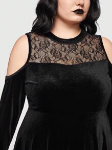 Goth Große Größe Kleid mit schulterfrei Kontrast Spitzen, Samt ohne Gürtel