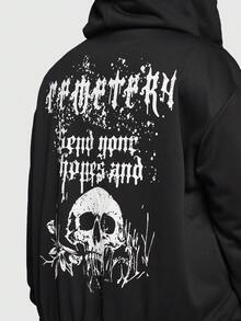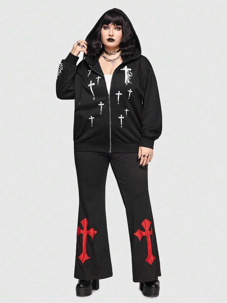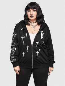 Goth Große Größe Hoodie mit Kreuz, Buchstaben Grafik, Reißverschluss, Tunnelzug,