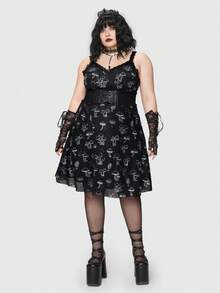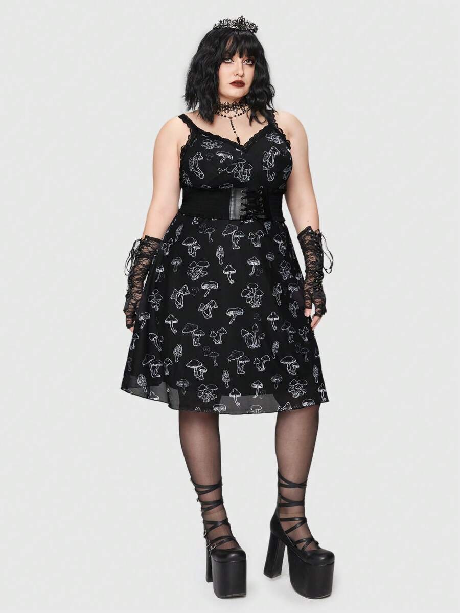 Goth Cami Kleid mit Pilzmuster, Kontrast Spitzen,