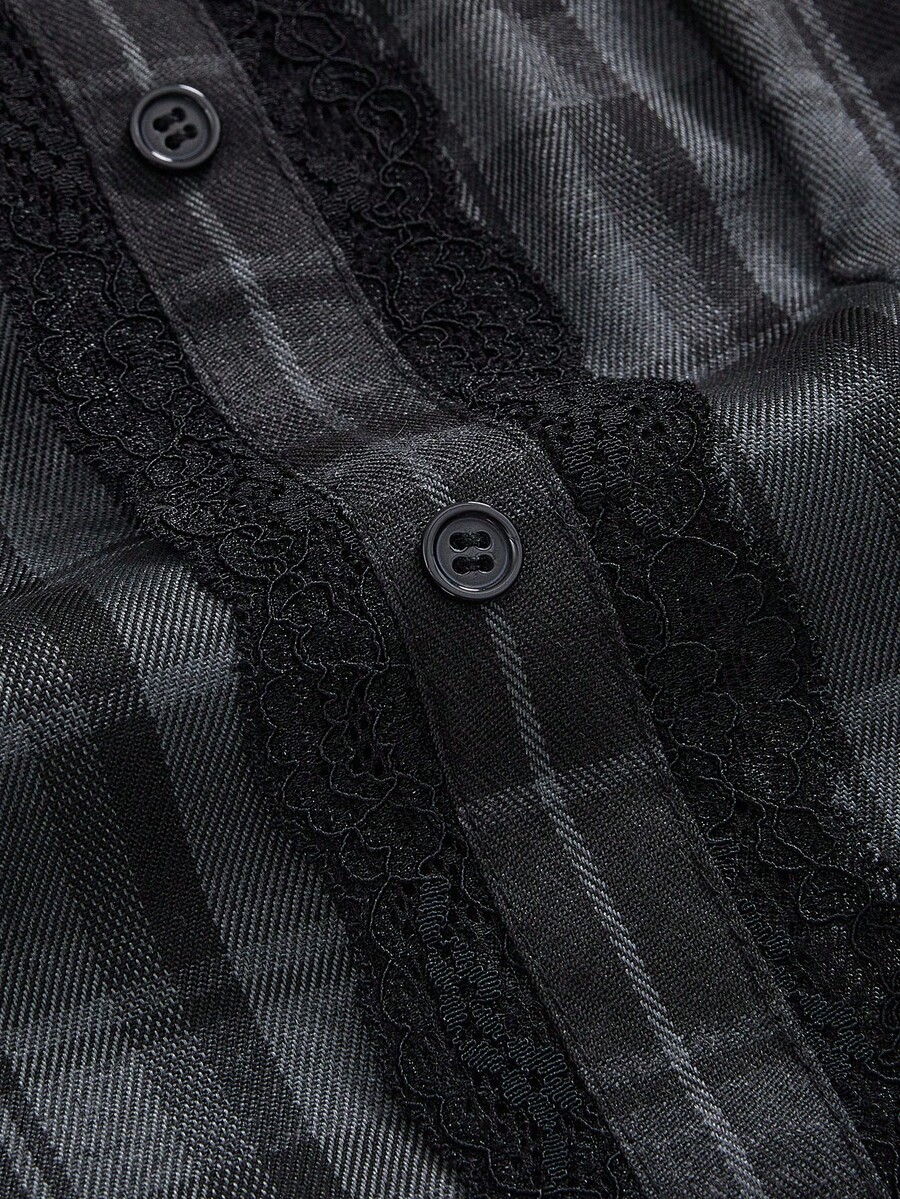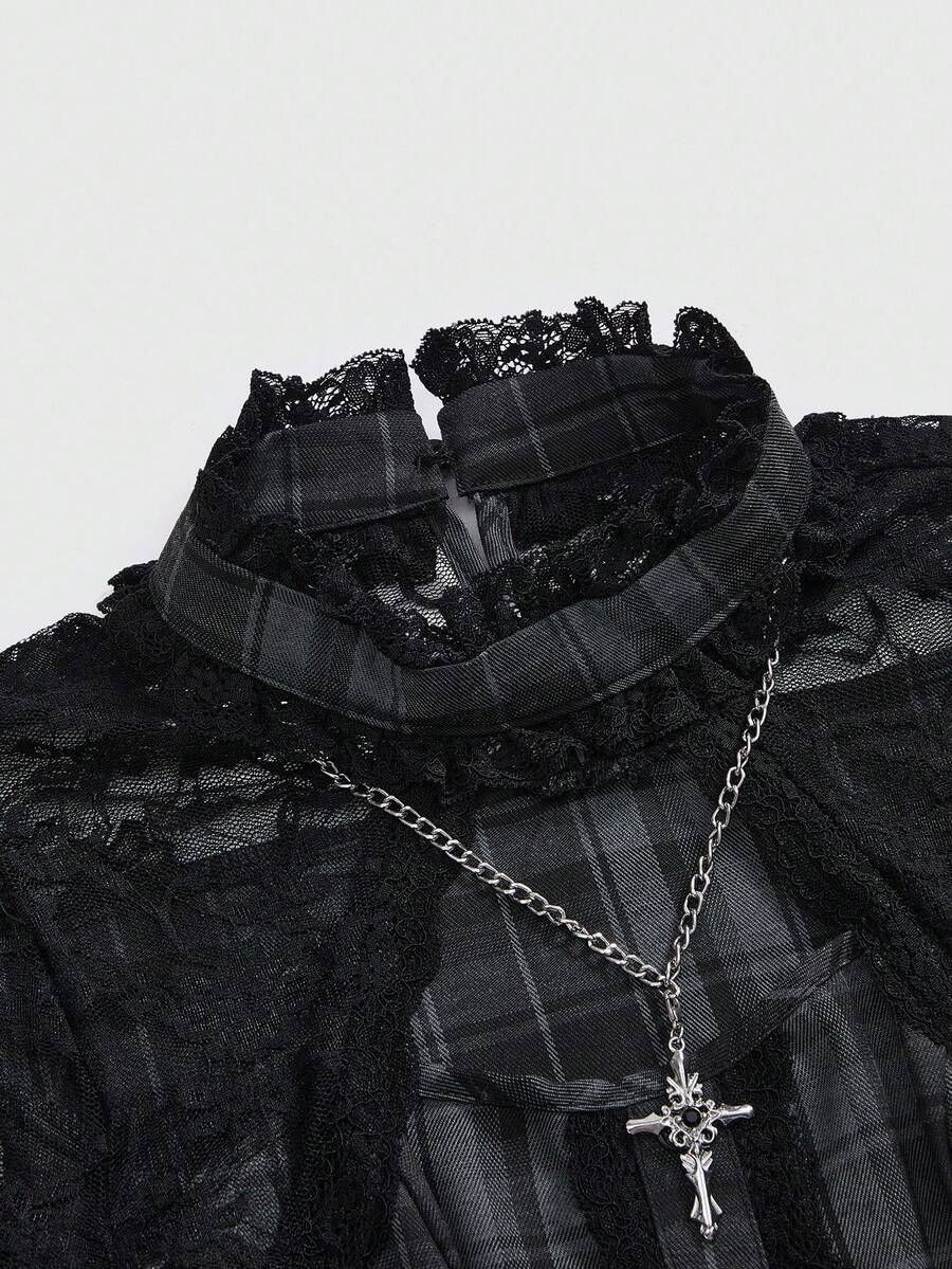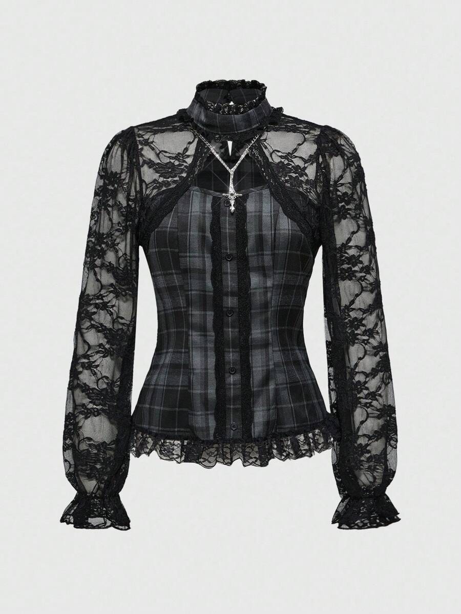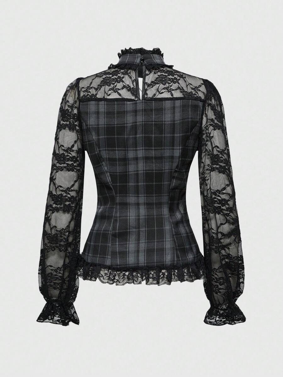 Goth Schulmädchen-Stil Kontrast Spitze Puffärmel Taille geraffte karierte Bluse für Frauen