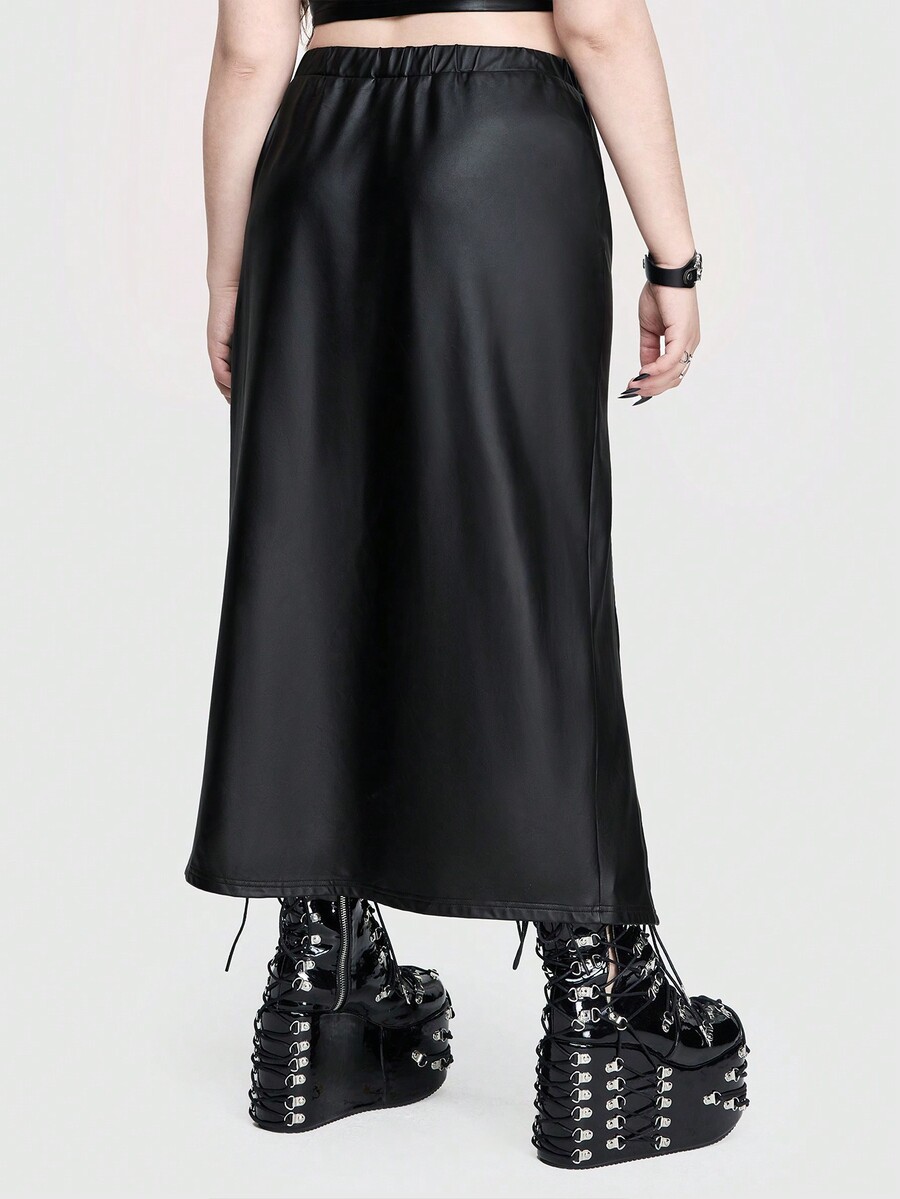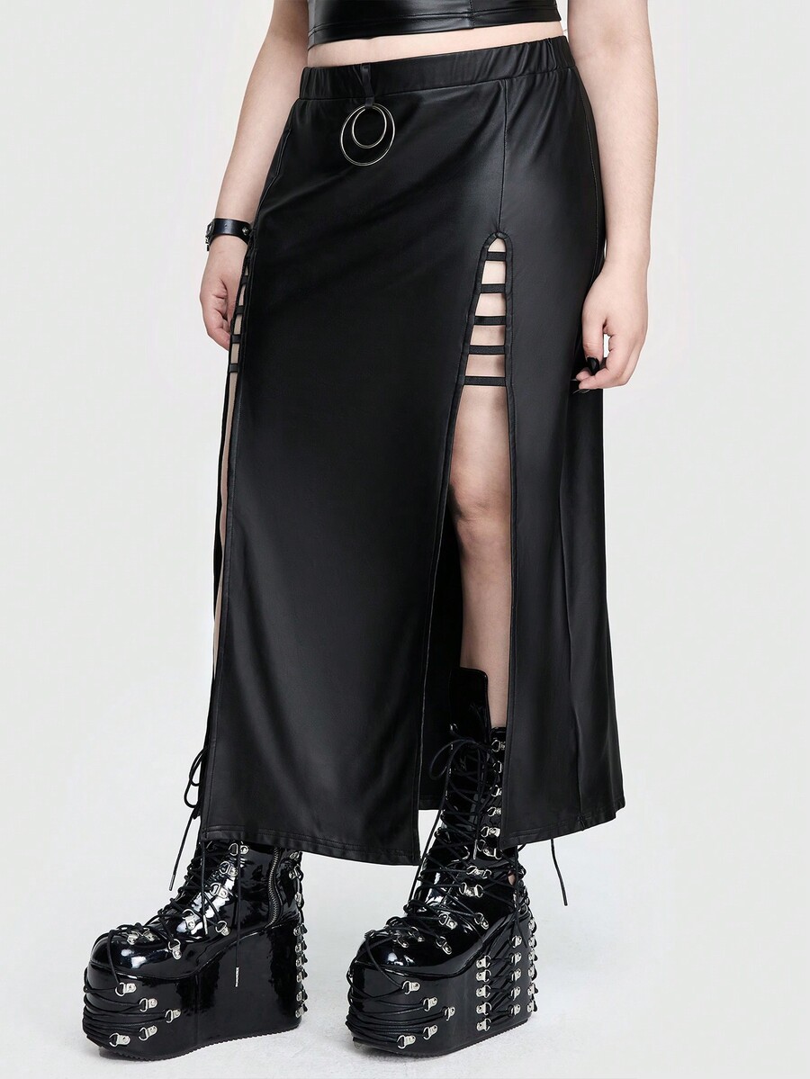 Goth Sexy, reife, elegante, hohe Schlitze, Slim Fit mit gekreuzten Trägern, runden Ringen und mondgeformten metallischen Verzierungen, dehnbarer einfarbiger Rock in Große Größen für Partys