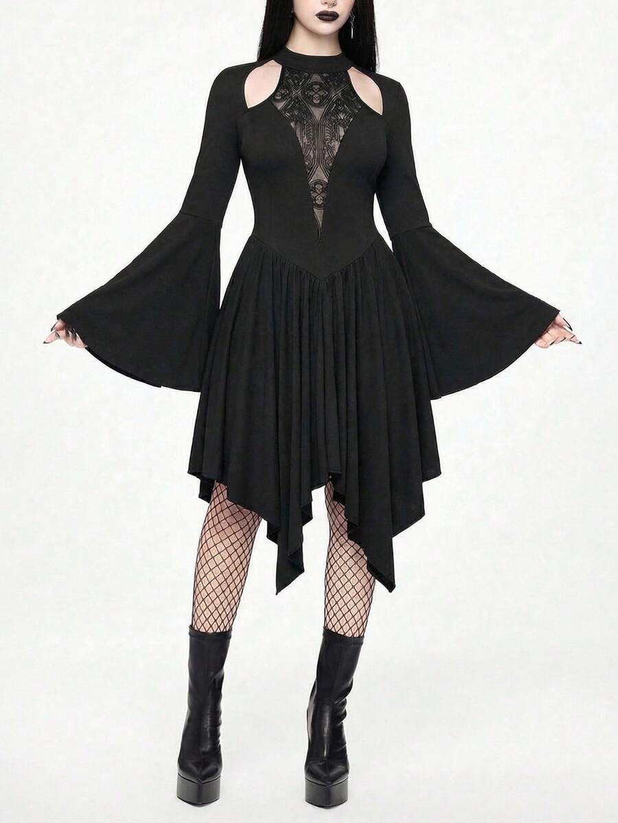 Goth Gotischer Stil Off-Shoulder Mesh-Patchwork Tiefer V-Ausschnitt Weite Ärmel Asymmetrischer Saum Damen Mini-Kleid