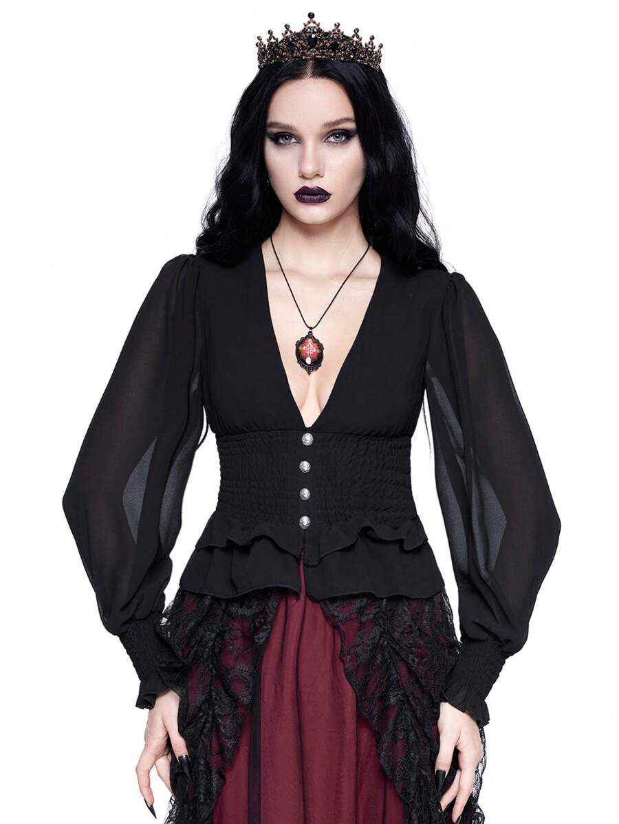 Goth Vintage romantisch gotischer Valentinstag Damen Bluse mit tiefem geraffter geschmückter Taille und Puffärmeln