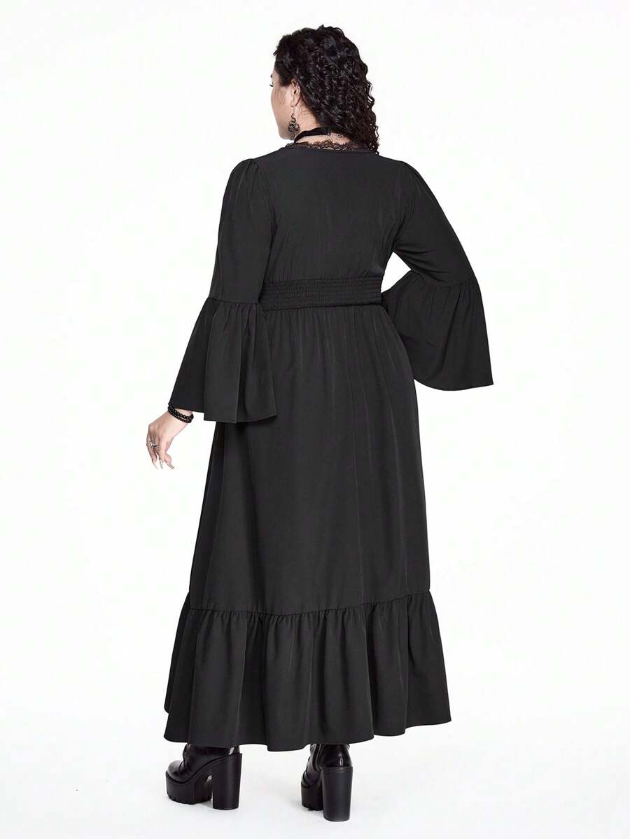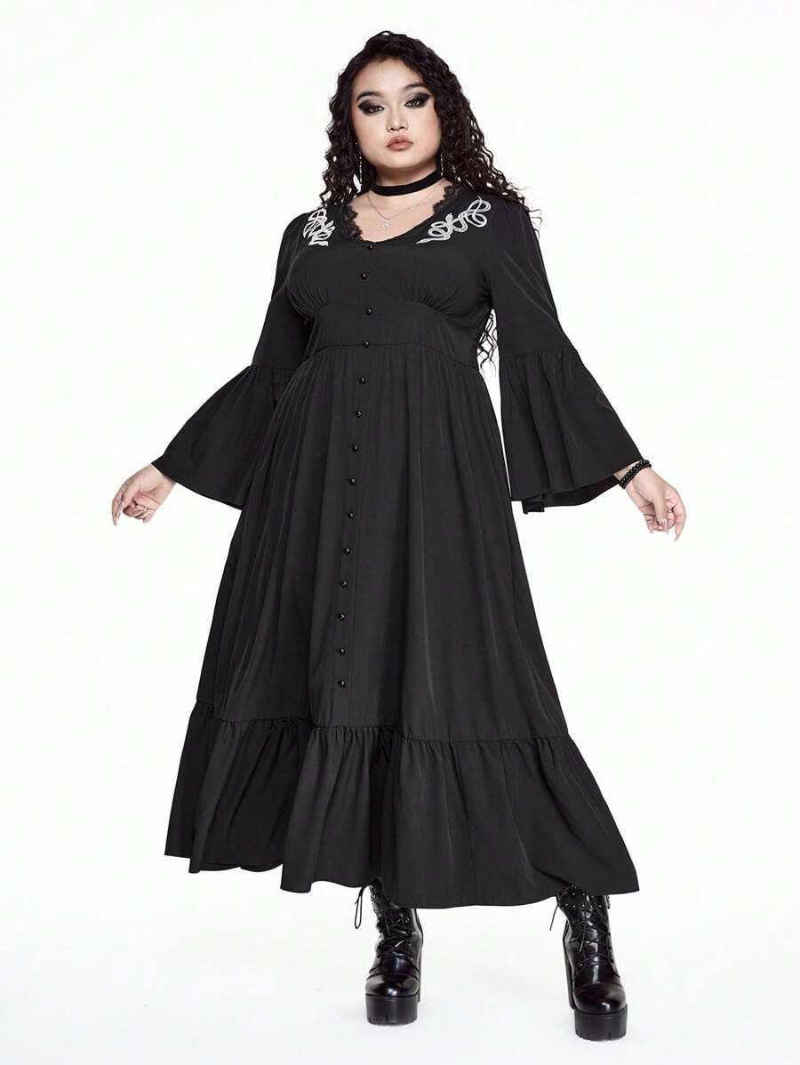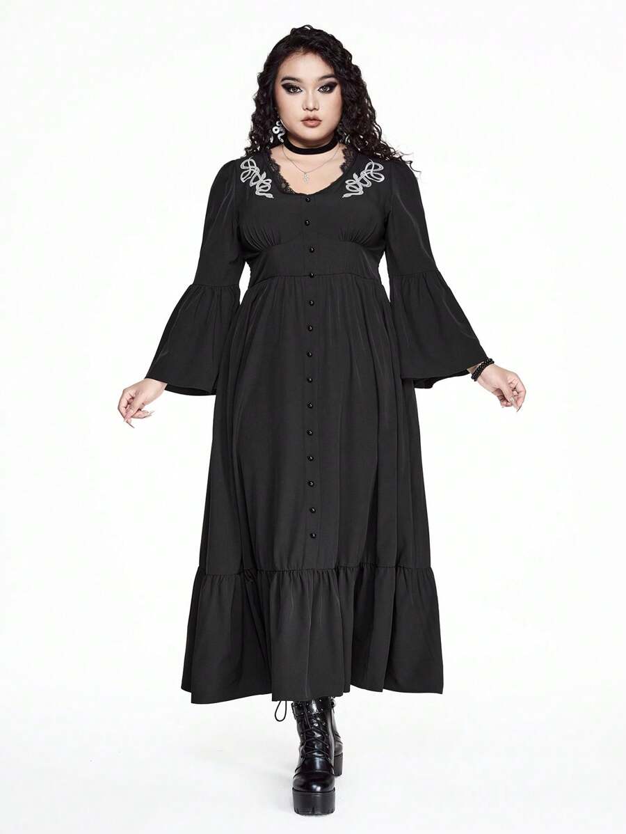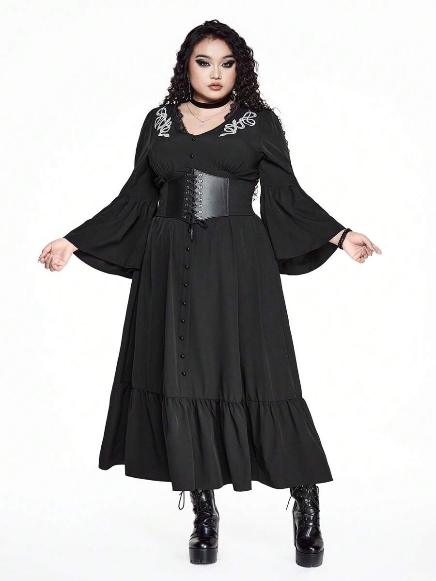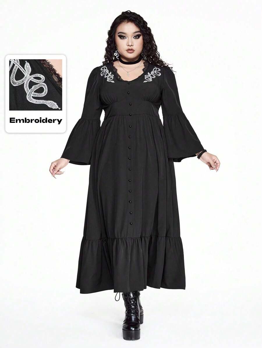 Goth Damen Kleid mit tiefem V-Ausschnitt, Kontrast-Spitze, Schlangenhaut-Muster und Stickerei, Glockenärmel