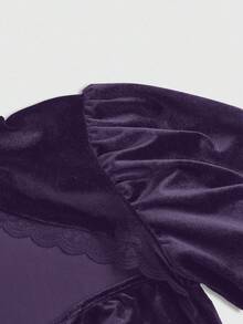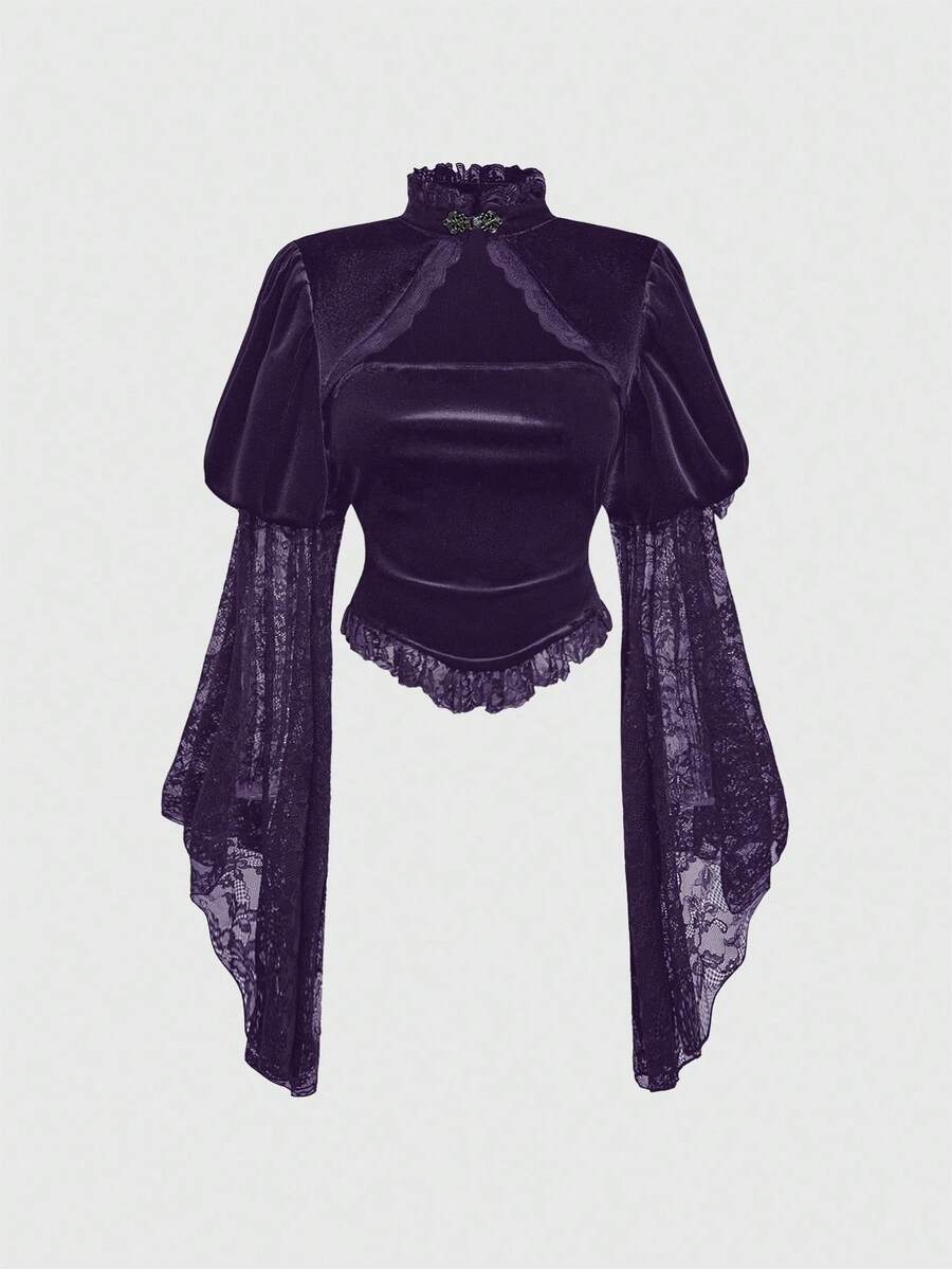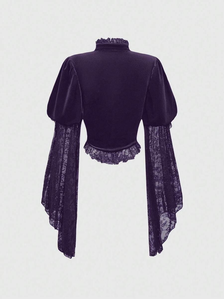 Goth Damen elegante Bluse mit Stehkragen, Glockenärmeln, Samt- und Spitzeneinsätzen
