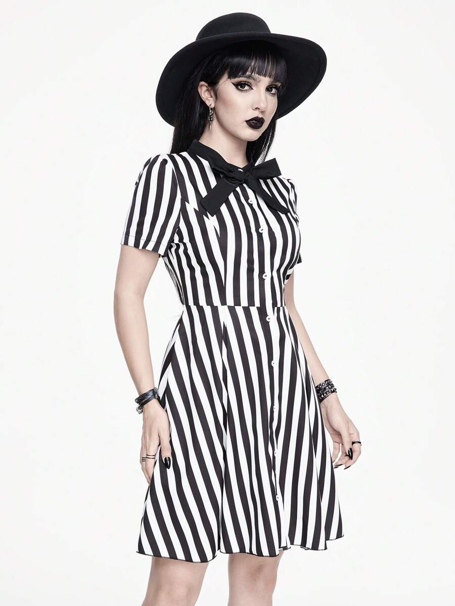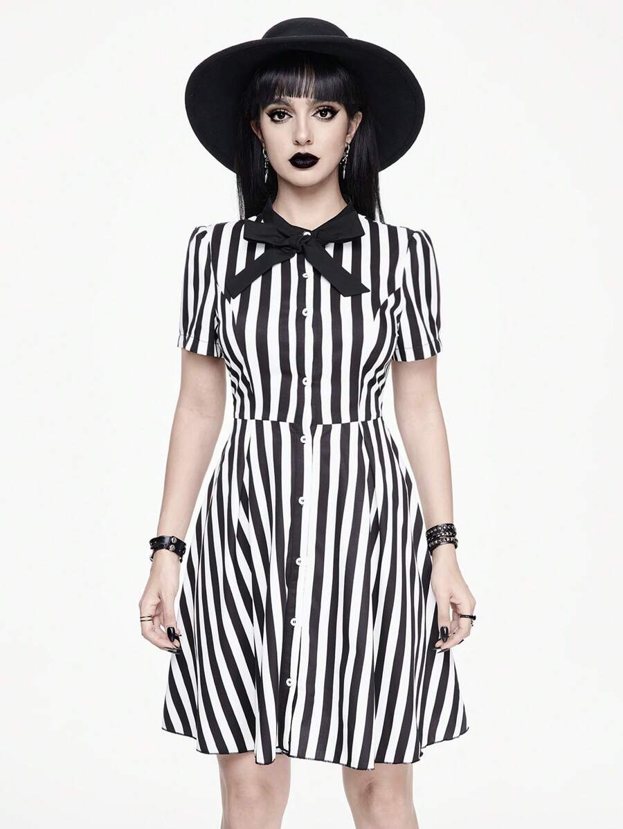 Goth Damen Sommer Mode gestreiftes Kleid mit Taille Raffung, Schleifen Akzenten und Knopfverschluss vorne, Schule